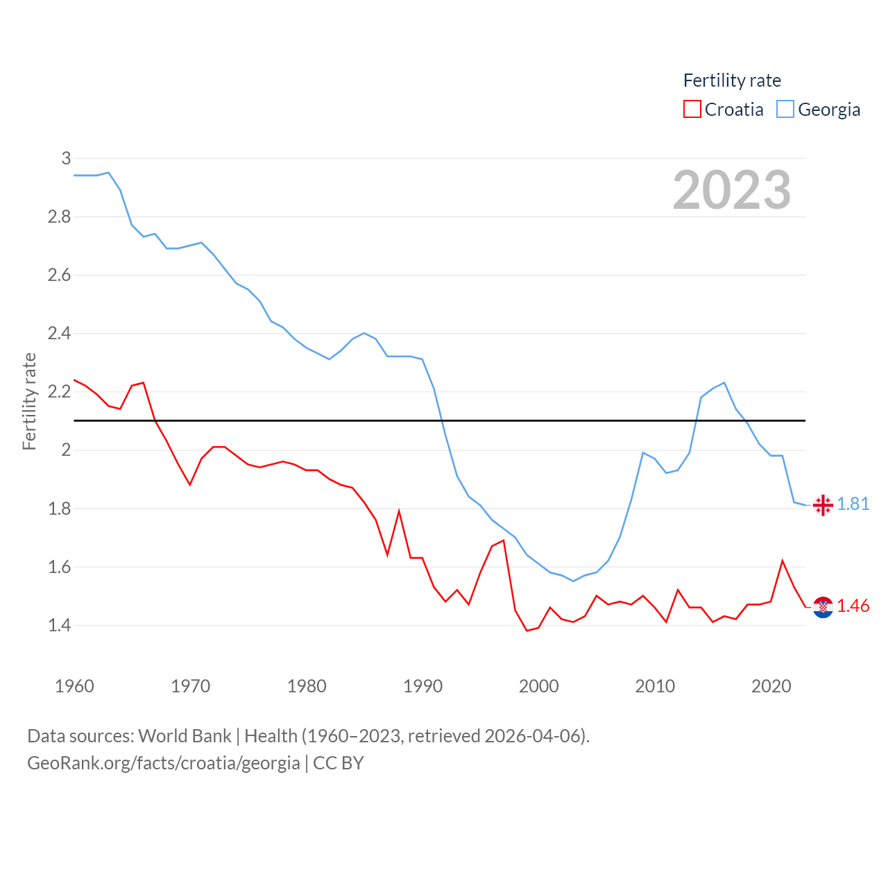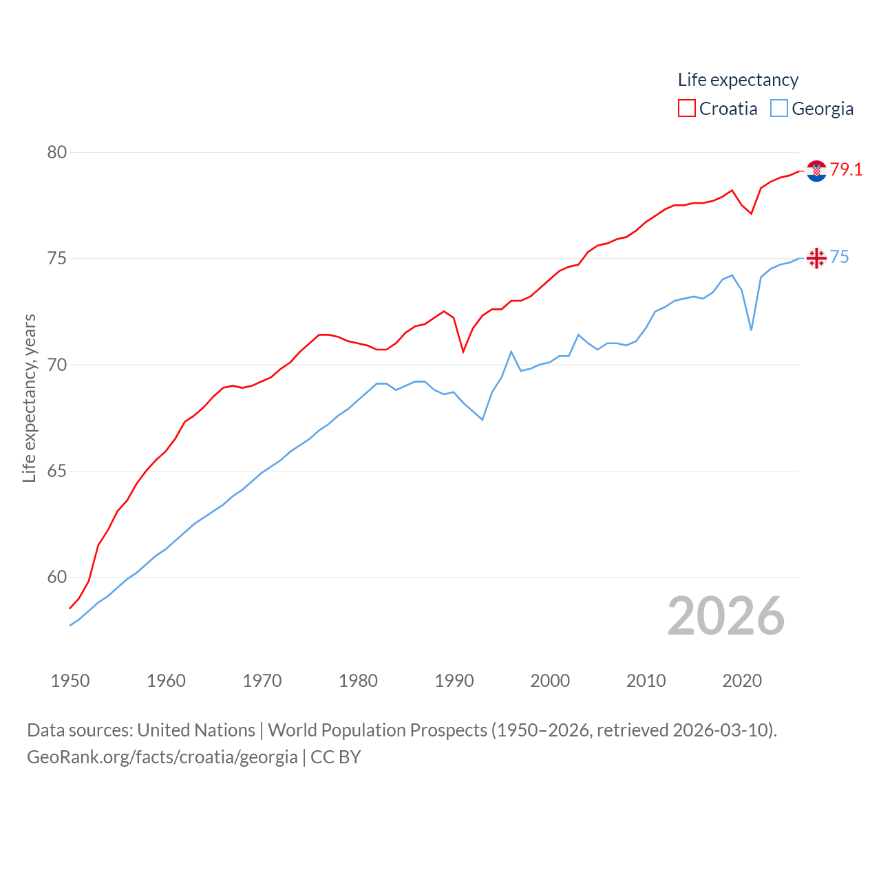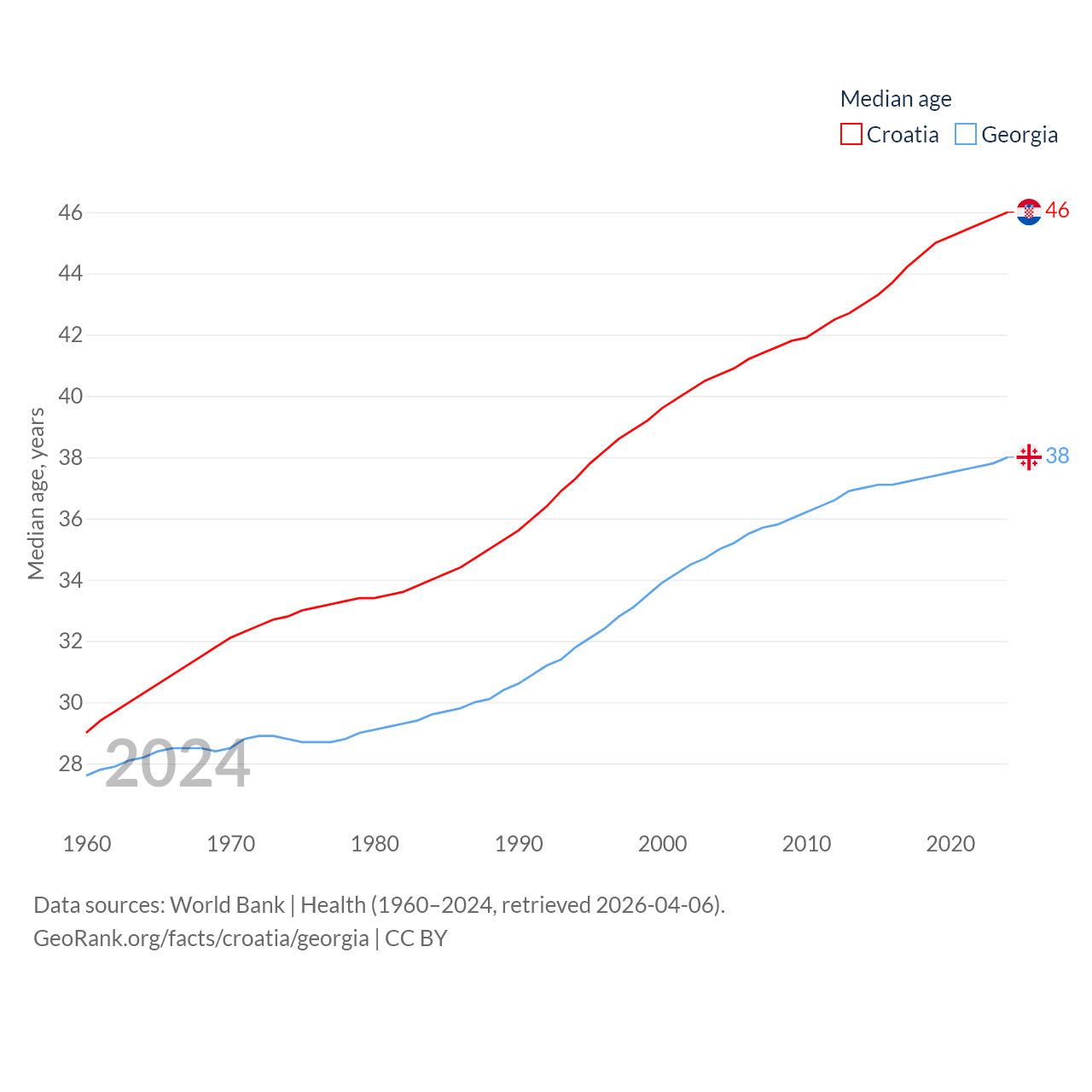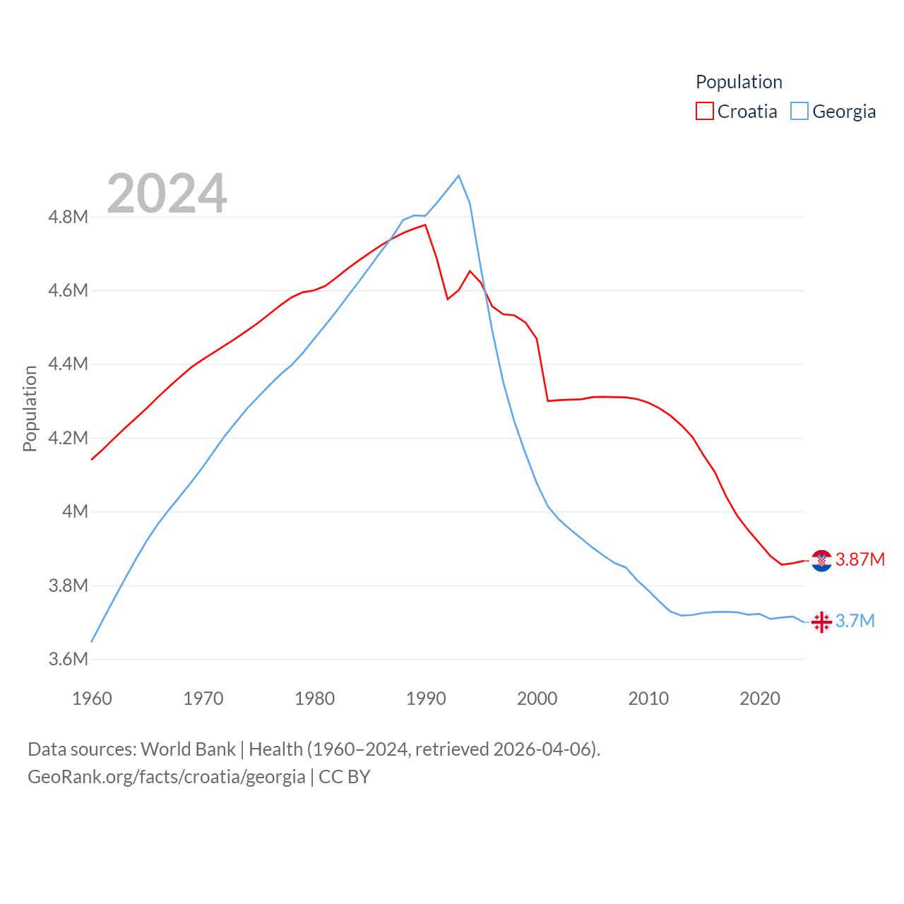 Croatia has a population of 3.87M (ranked 129/197), compared with 3.7M in Georgia (ranked 130/197). Croatia's land area is 21,606 sq mi versus 26,830 sq mi for Georgia (ranked 123rd vs. 118th).