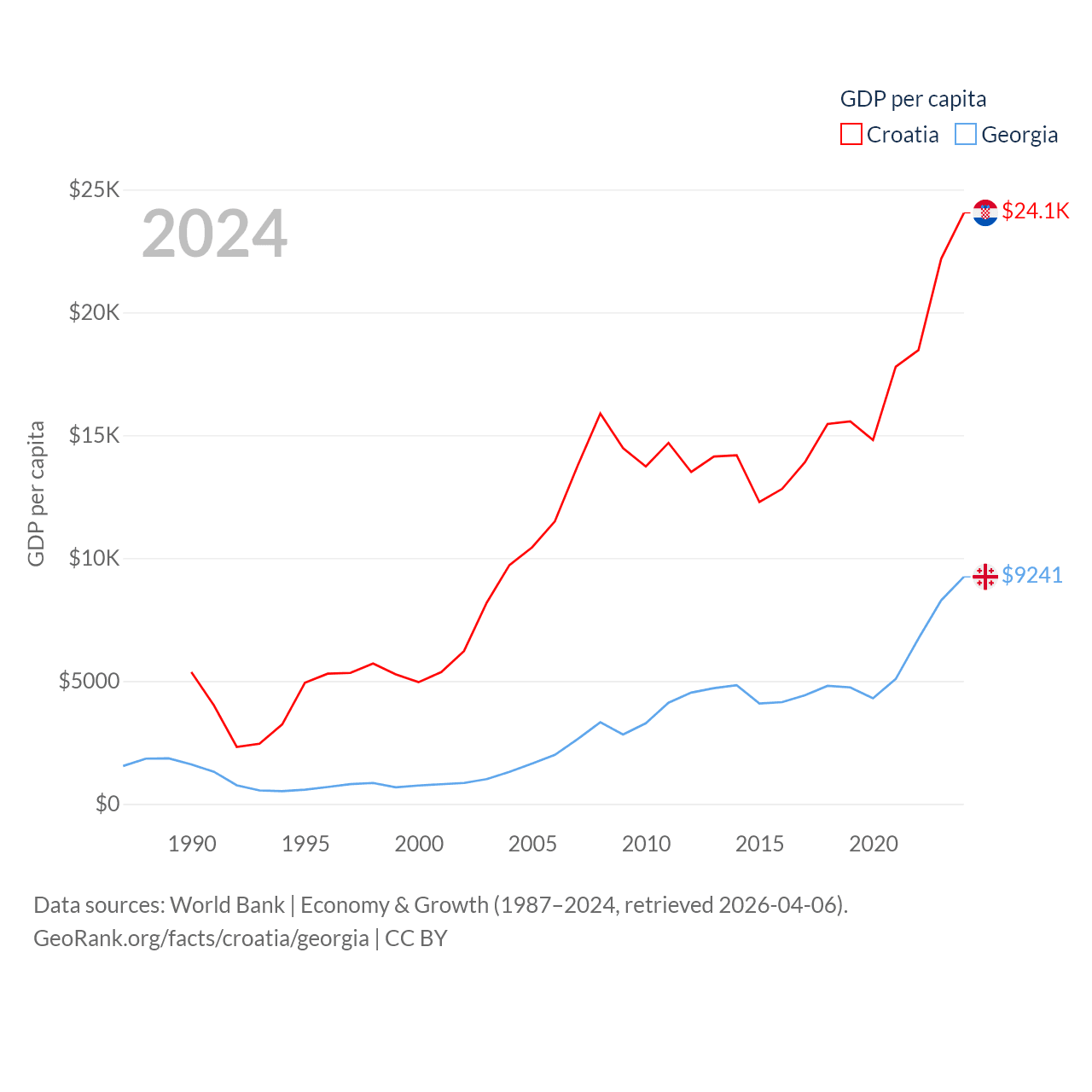 By GDP, Croatia ranks 75/197 ($93B) and Georgia ranks 107/197 ($34.2B). By GDP per capita, Croatia ranks 50/197 ($24,050), while Georgia ranks 89/197 ($9,241).