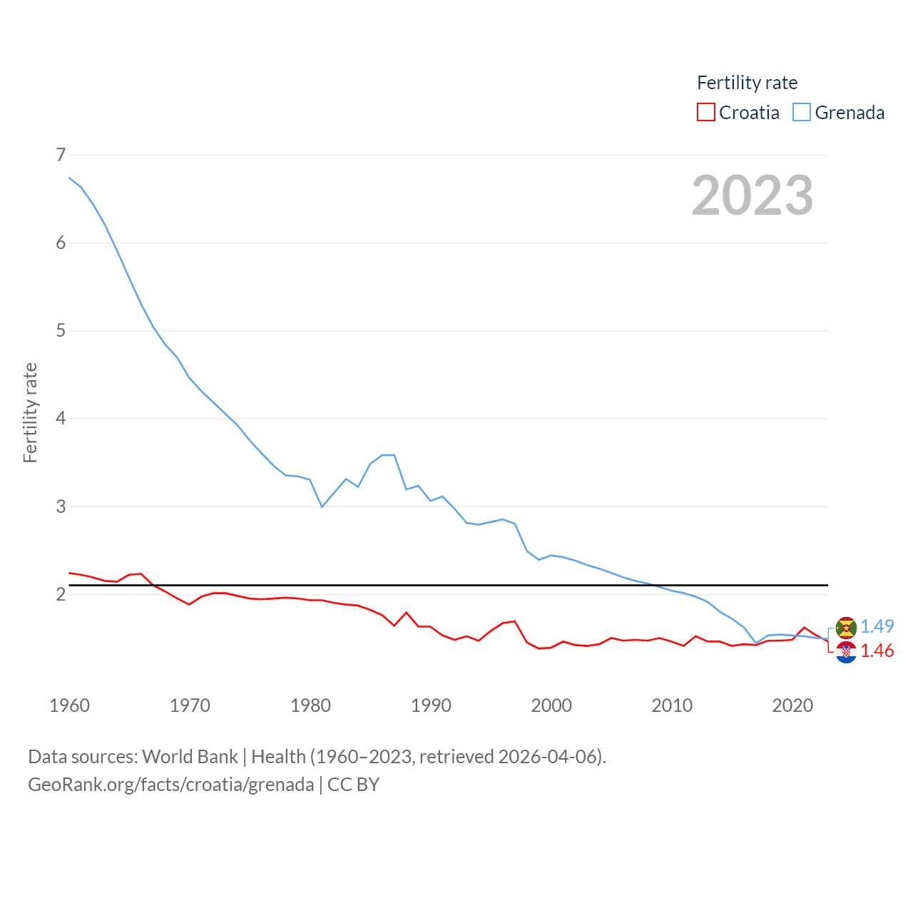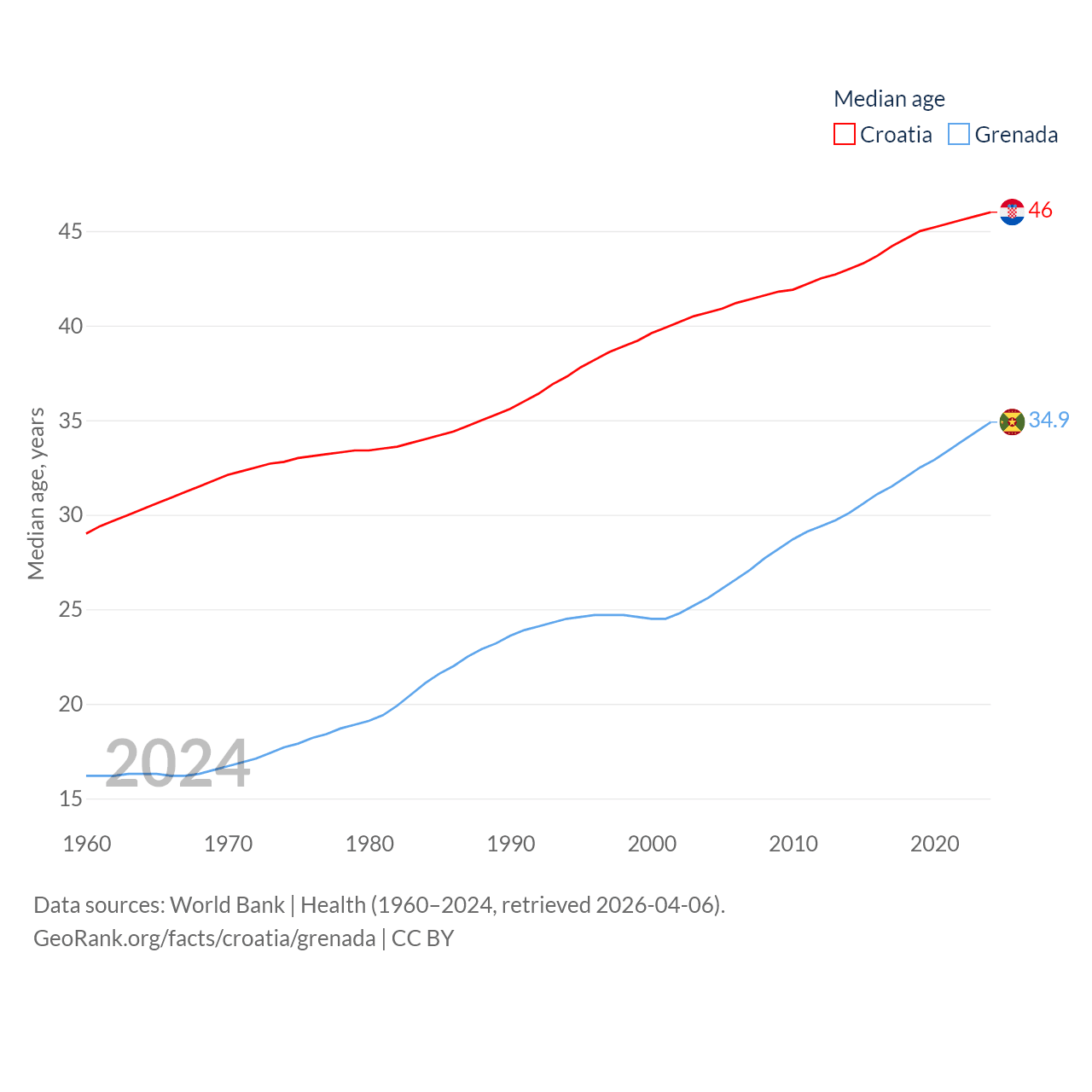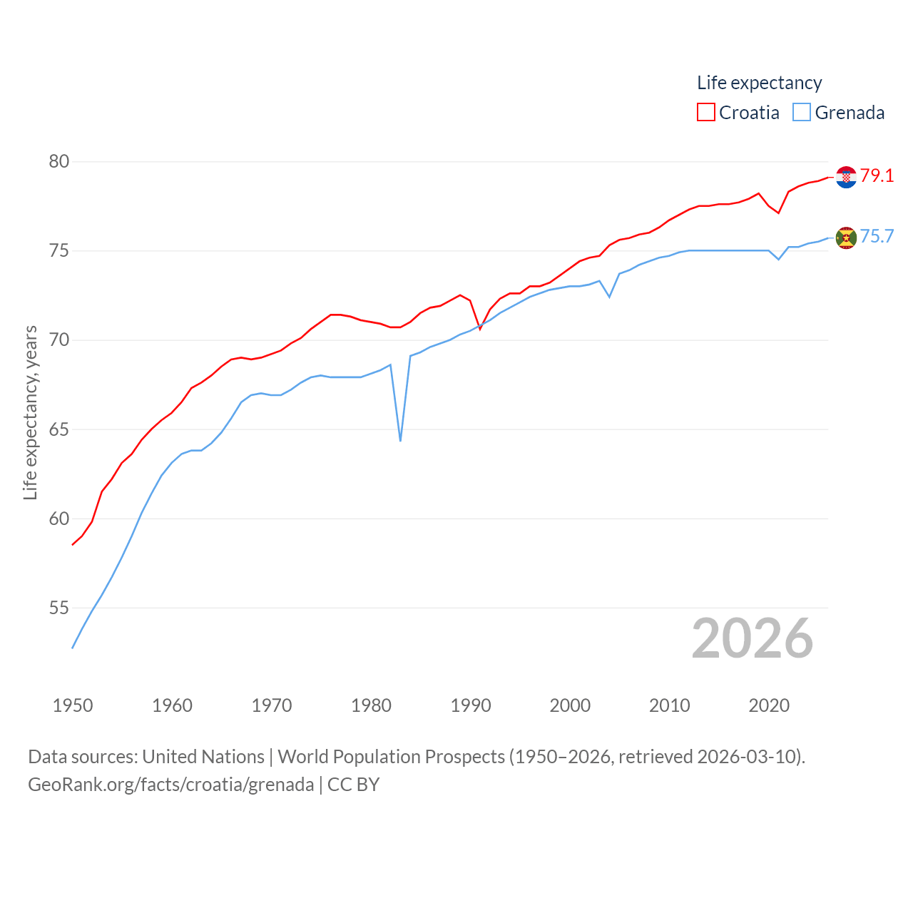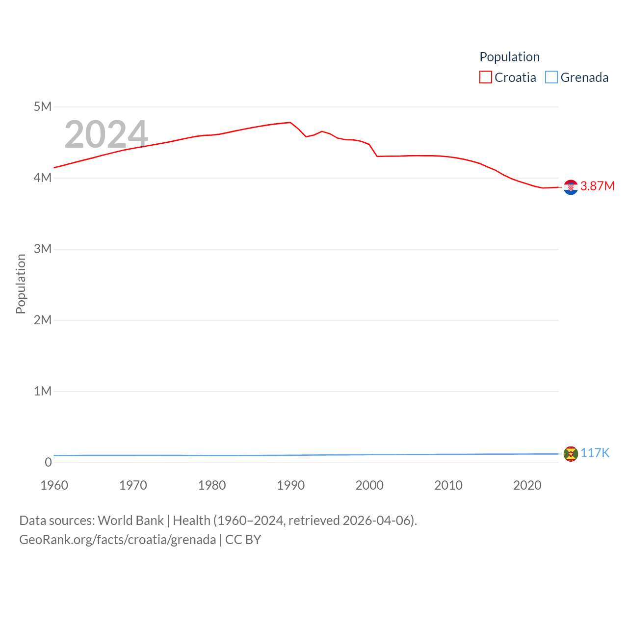 Croatia has a population of 3.87M (ranked 129/197), compared with 117K in Grenada (ranked 182/197). Croatia's land area is 21,606 sq mi versus 131.3 sq mi for Grenada (ranked 123rd vs. 186th).