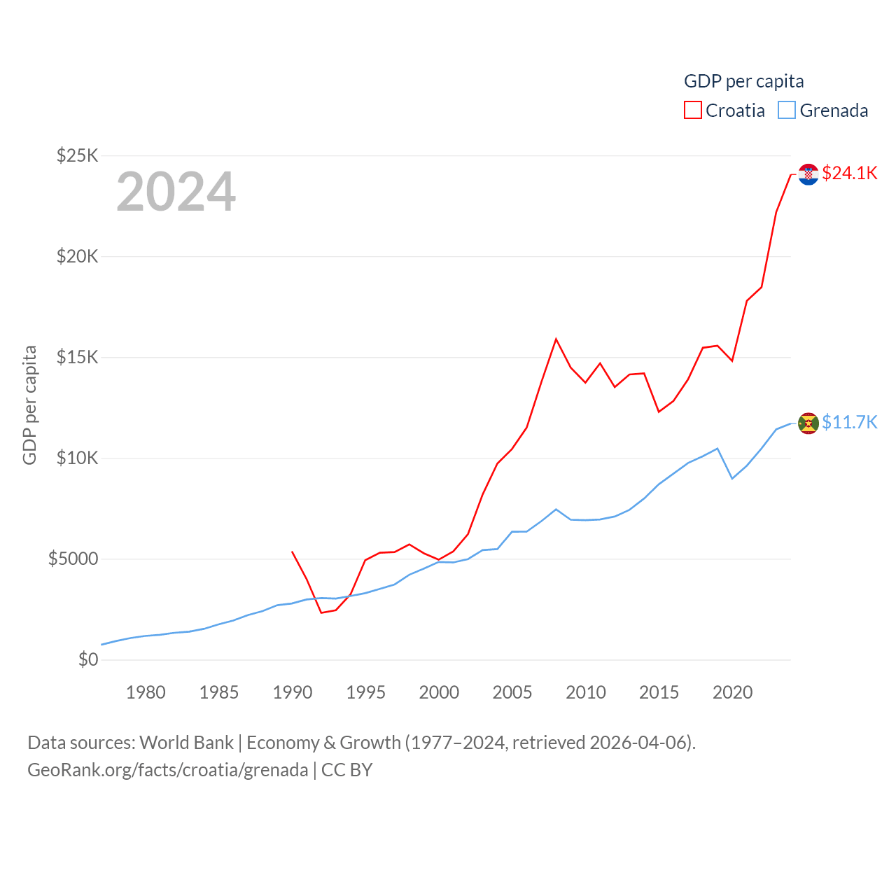 By GDP, Croatia ranks 75/197 ($93B) and Grenada ranks 184/197 ($1.37B). By GDP per capita, Croatia ranks 50/197 ($24,050), while Grenada ranks 80/197 ($11,705).