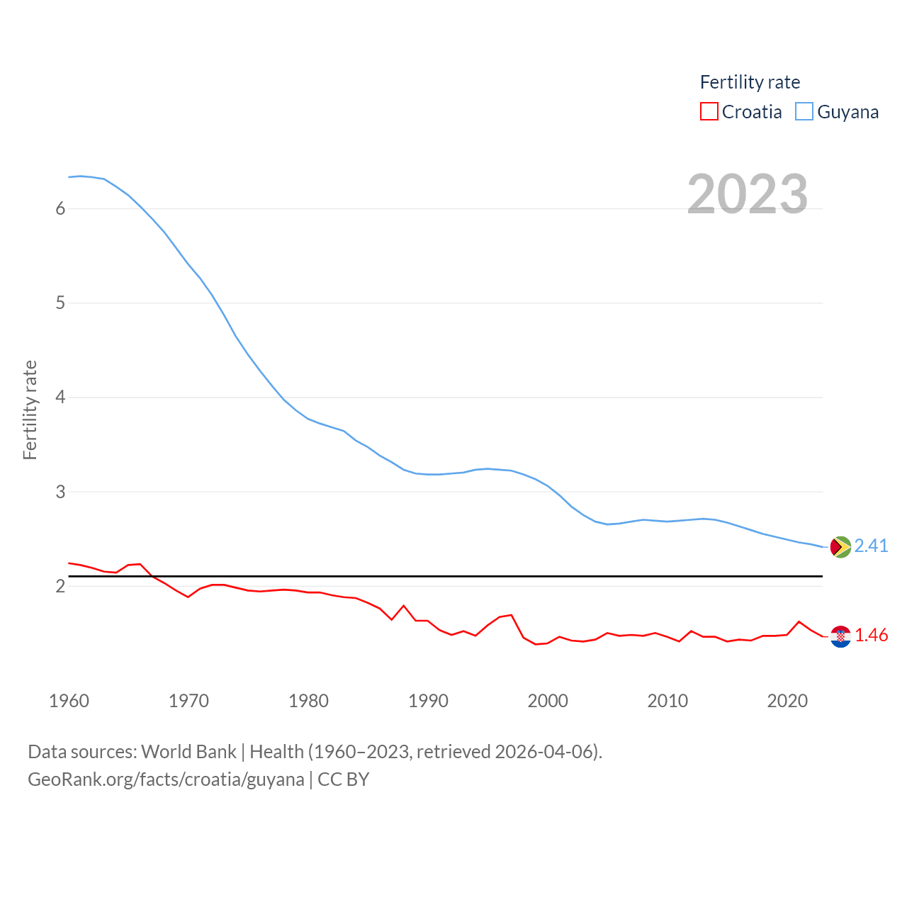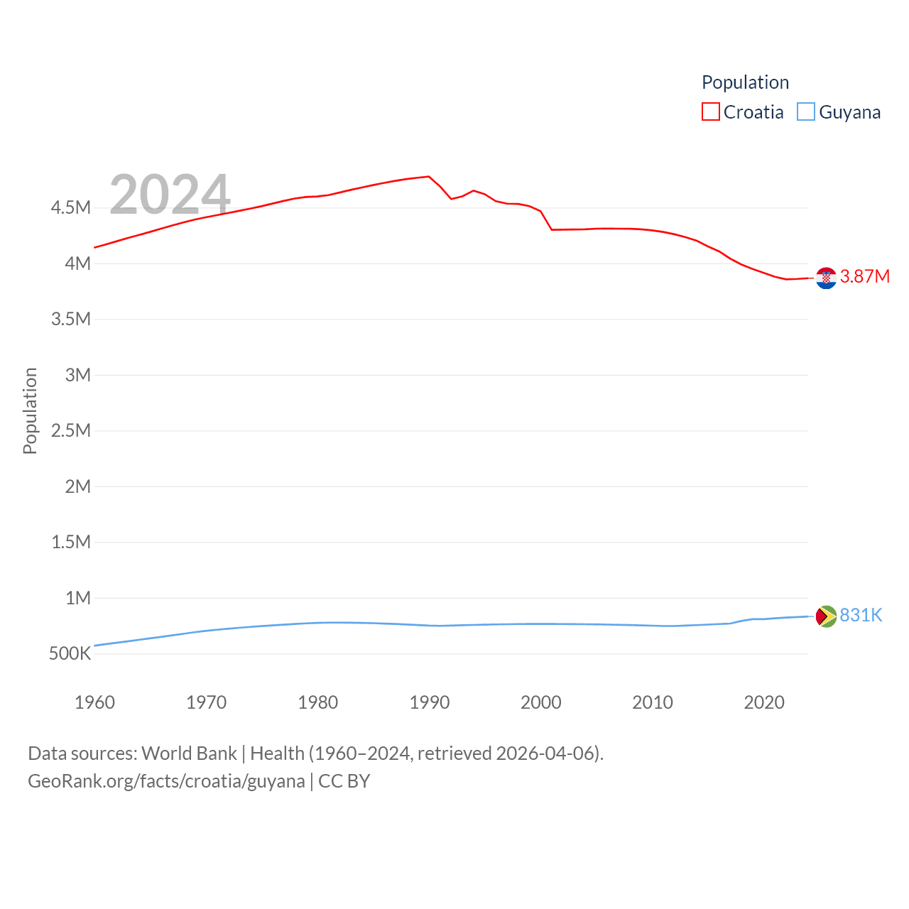 Croatia has a population of 3.87M (ranked 129/197), compared with 831K in Guyana (ranked 161/197). Croatia's land area is 21,606 sq mi versus 81,522 sq mi for Guyana (ranked 123rd vs. 82nd).