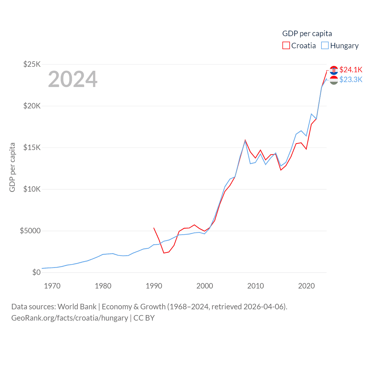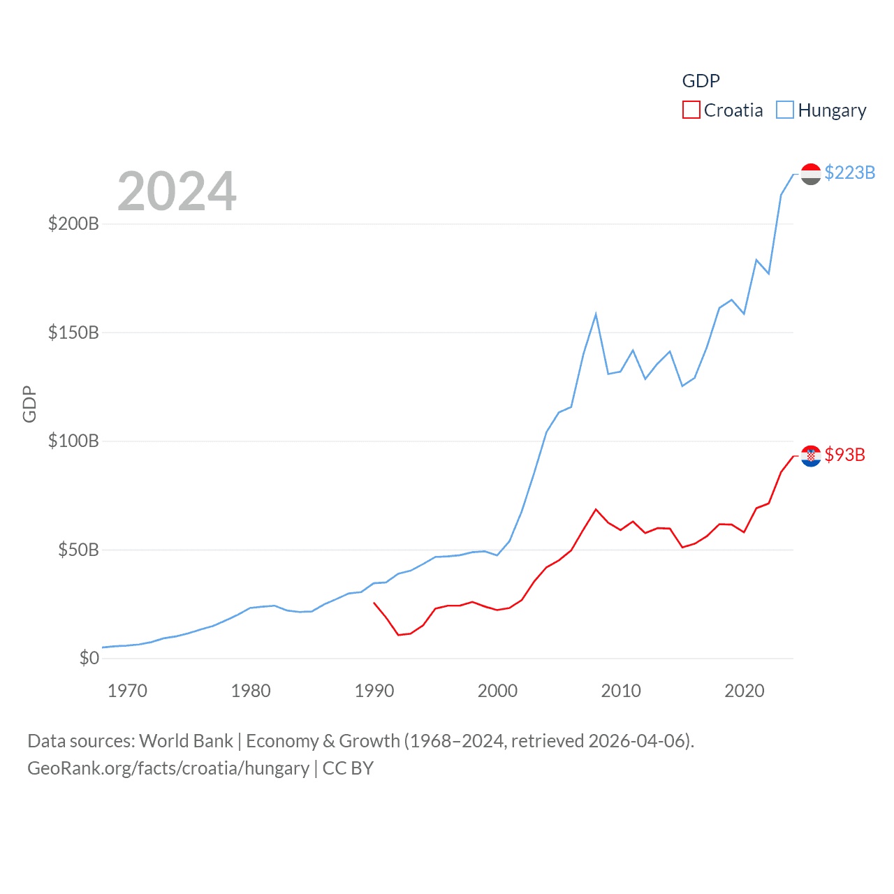 By GDP, Croatia ranks 75/197 ($93B) and Hungary ranks 55/197 ($223B). By GDP per capita, Croatia ranks 50/197 ($24,050), while Hungary ranks 55/197 ($23,292).