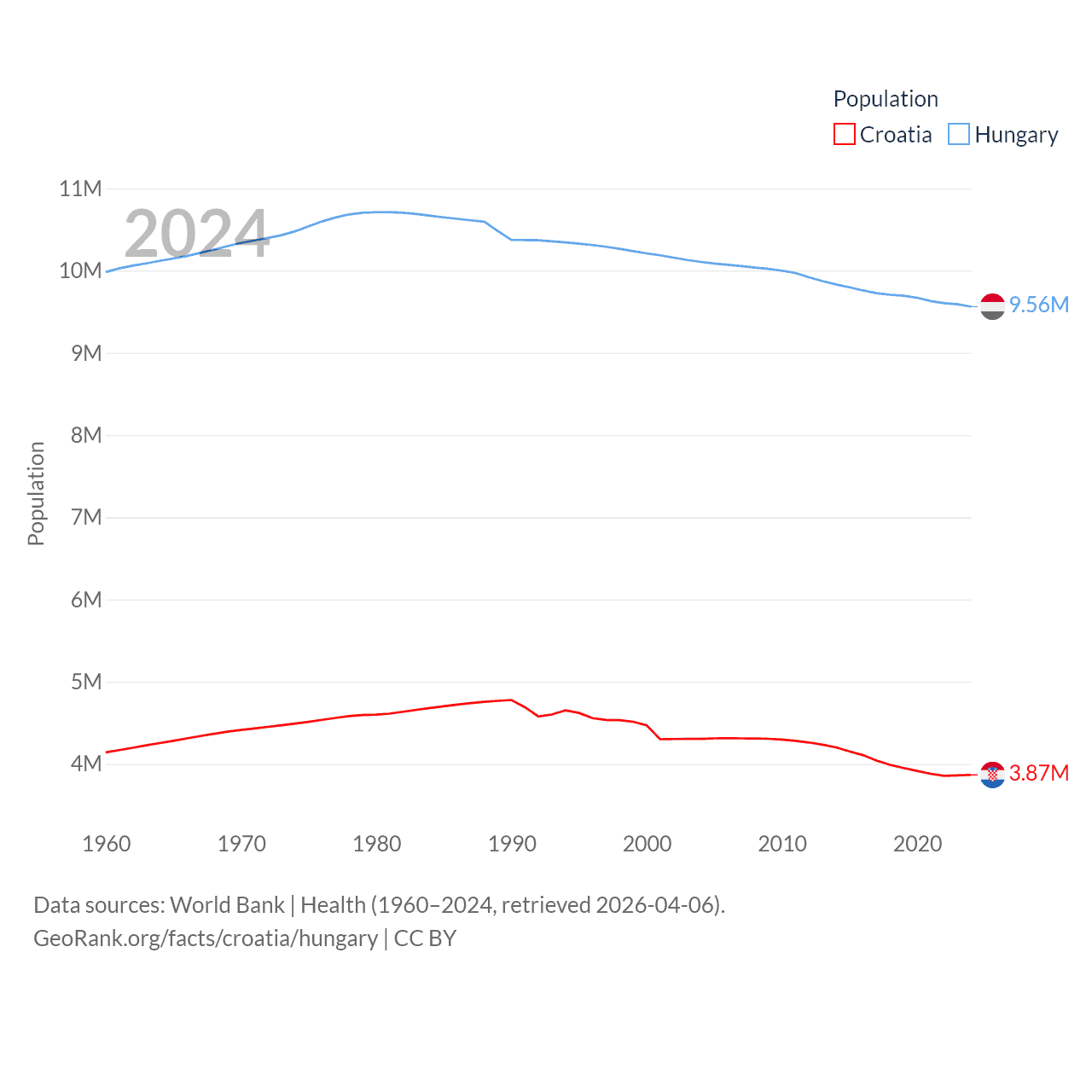 Croatia has a population of 3.87M (ranked 129/197), compared with 9.56M in Hungary (ranked 97/197). Croatia's land area is 21,606 sq mi versus 35,236 sq mi for Hungary (ranked 123rd vs. 109th).