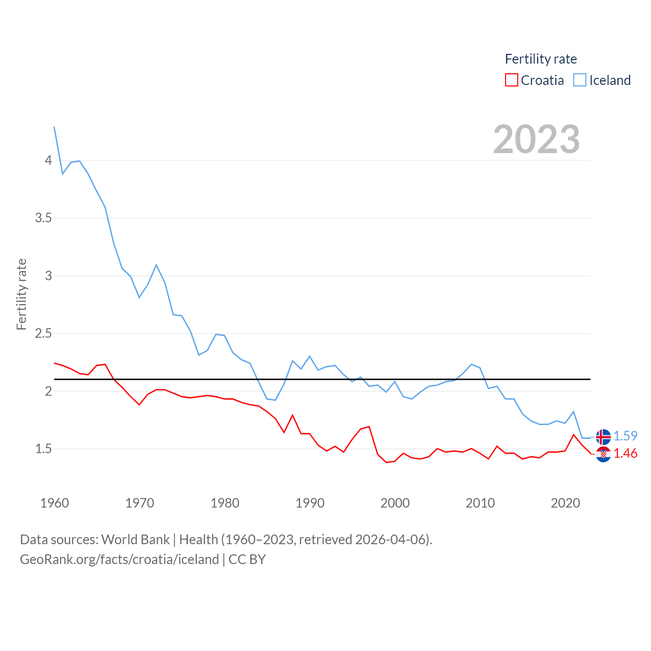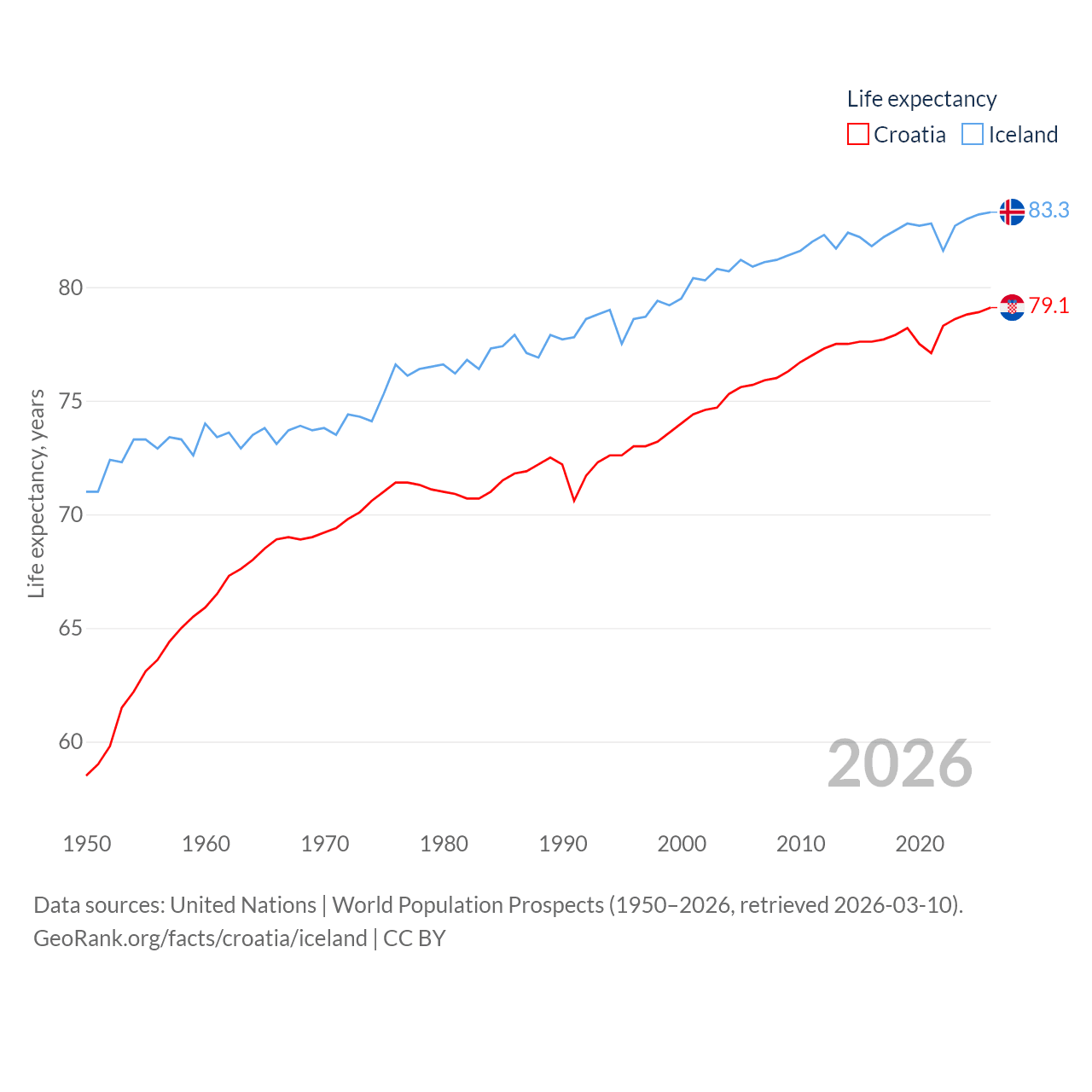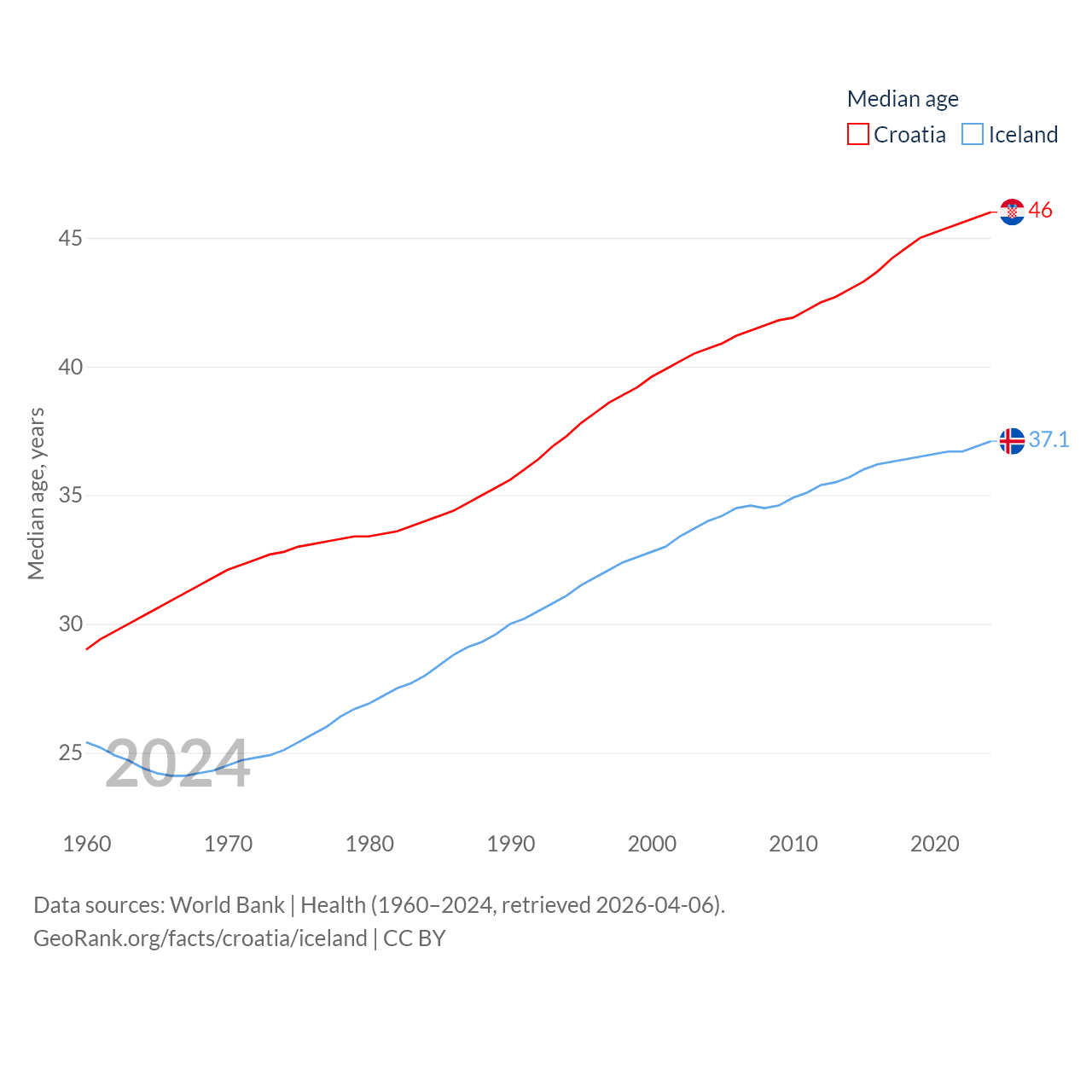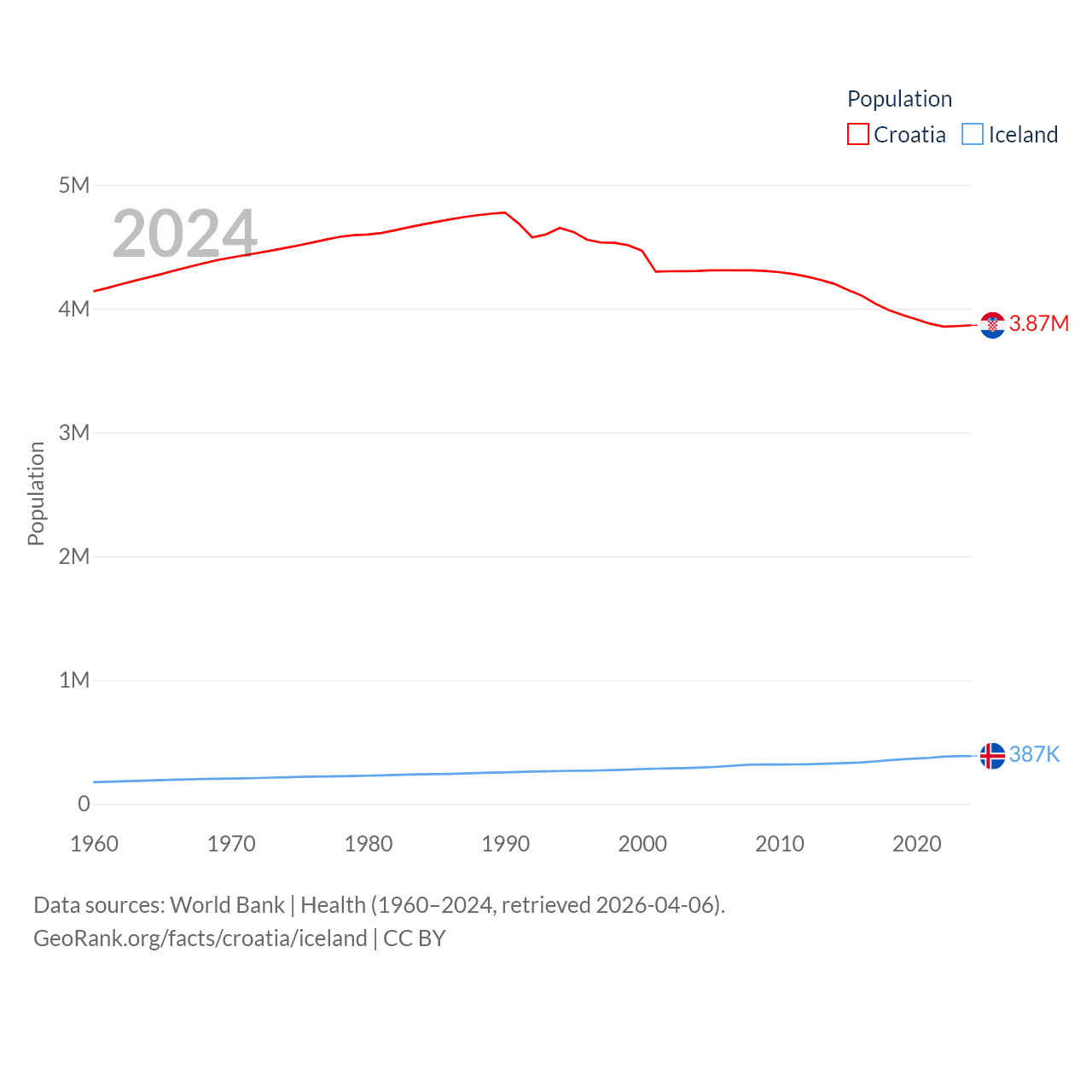 Croatia has a population of 3.87M (ranked 129/197), compared with 387K in Iceland (ranked 173/197). Croatia's land area is 21,606 sq mi versus 38,931 sq mi for Iceland (ranked 123rd vs. 104th).