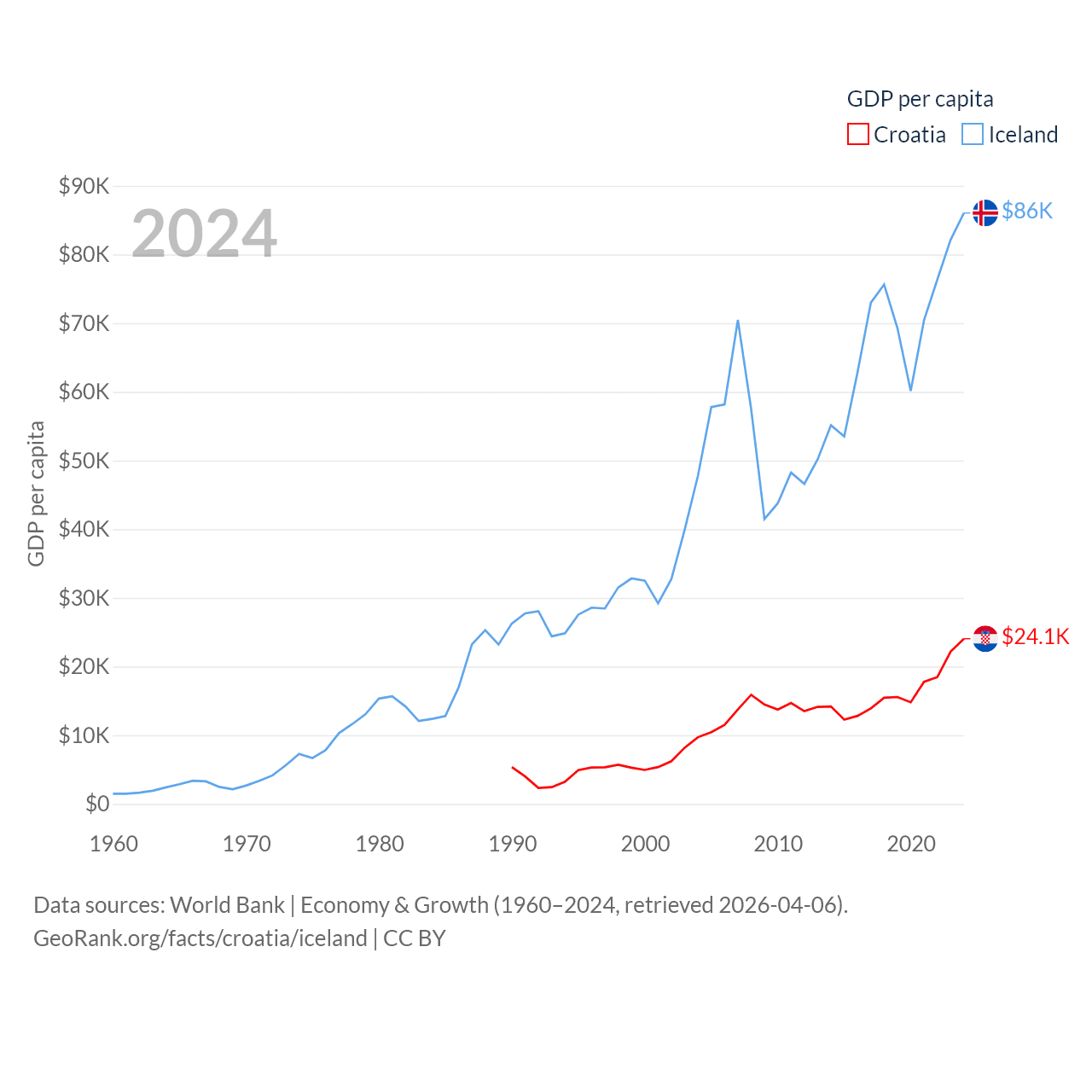 By GDP, Croatia ranks 75/197 ($93B) and Iceland ranks 108/197 ($33.3B). By GDP per capita, Croatia ranks 50/197 ($24,050), while Iceland ranks 9/197 ($86,041).