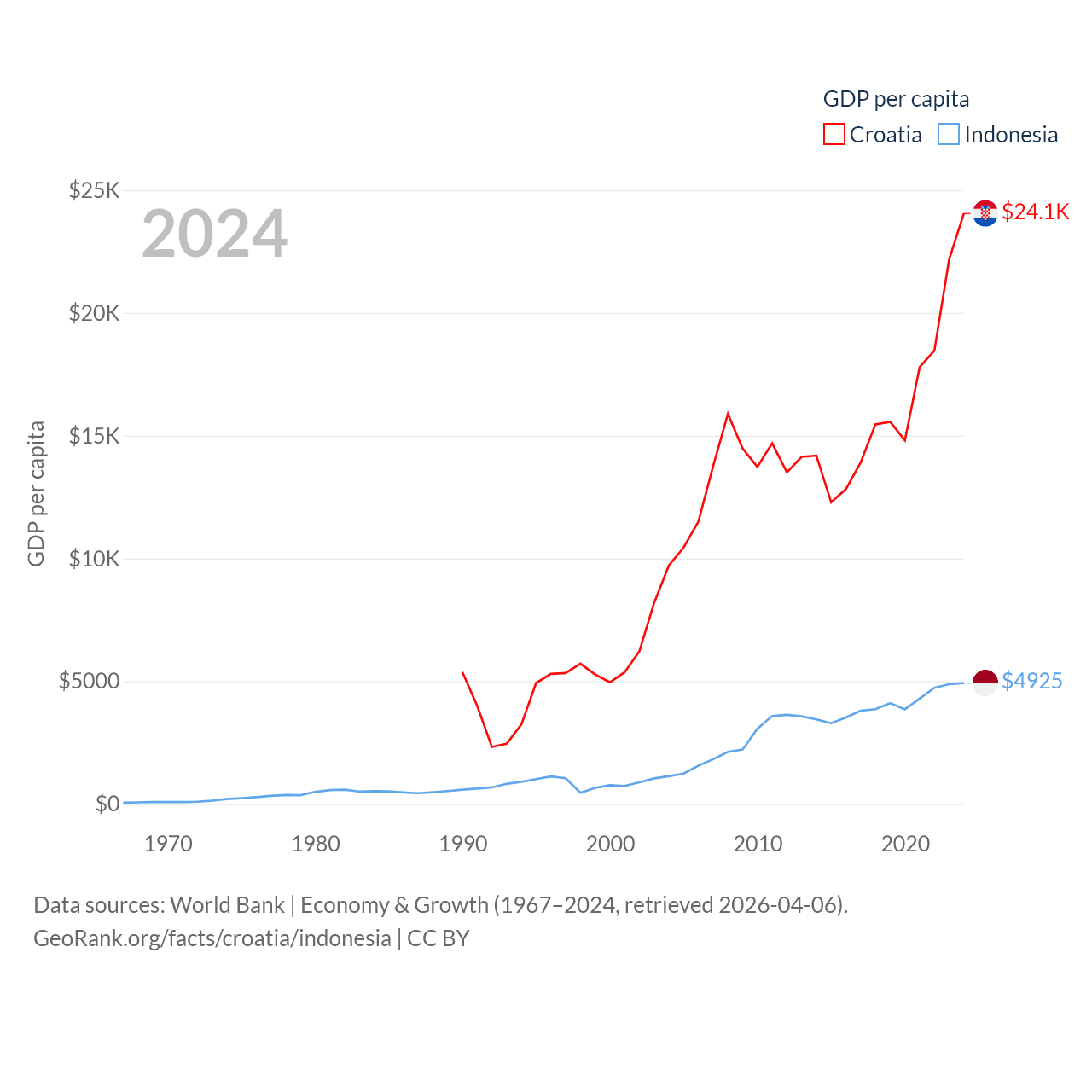 By GDP, Croatia ranks 75/197 ($93B) and Indonesia ranks 16/197 ($1.4T). By GDP per capita, Croatia ranks 50/197 ($24,050), while Indonesia ranks 121/197 ($4,925).
