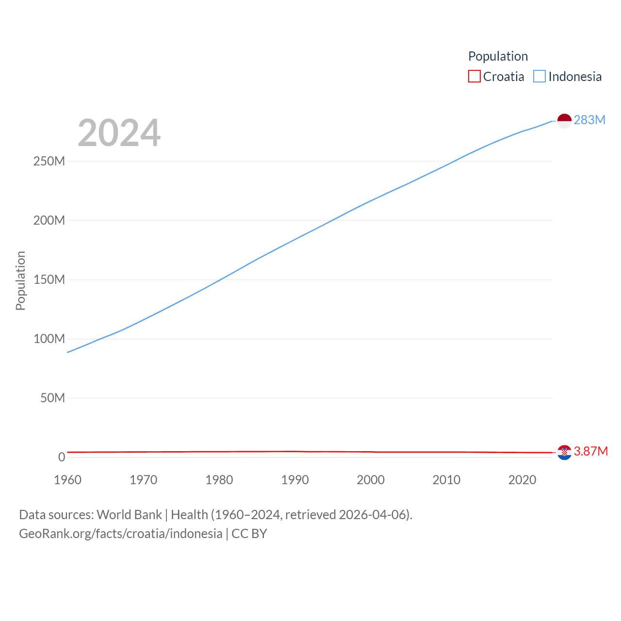 Croatia has a population of 3.87M (ranked 129/197), compared with 283M in Indonesia (ranked 4/197). Croatia's land area is 21,606 sq mi versus 730,720 sq mi for Indonesia (ranked 123rd vs. 14th).