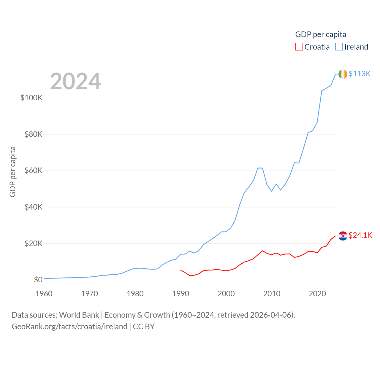 By GDP, Croatia ranks 75/197 ($93B) and Ireland ranks 25/197 ($609B). By GDP per capita, Croatia ranks 50/197 ($24,050), while Ireland ranks 4/197 ($112,895).