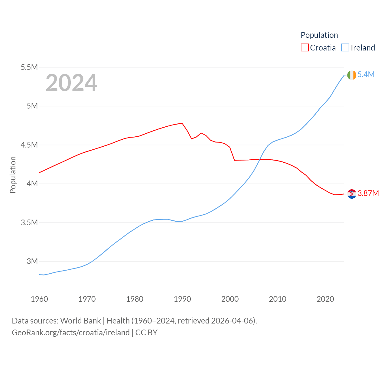 Croatia has a population of 3.87M (ranked 129/197), compared with 5.4M in Ireland (ranked 120/197). Croatia's land area is 21,606 sq mi versus 26,599 sq mi for Ireland (ranked 123rd vs. 119th).