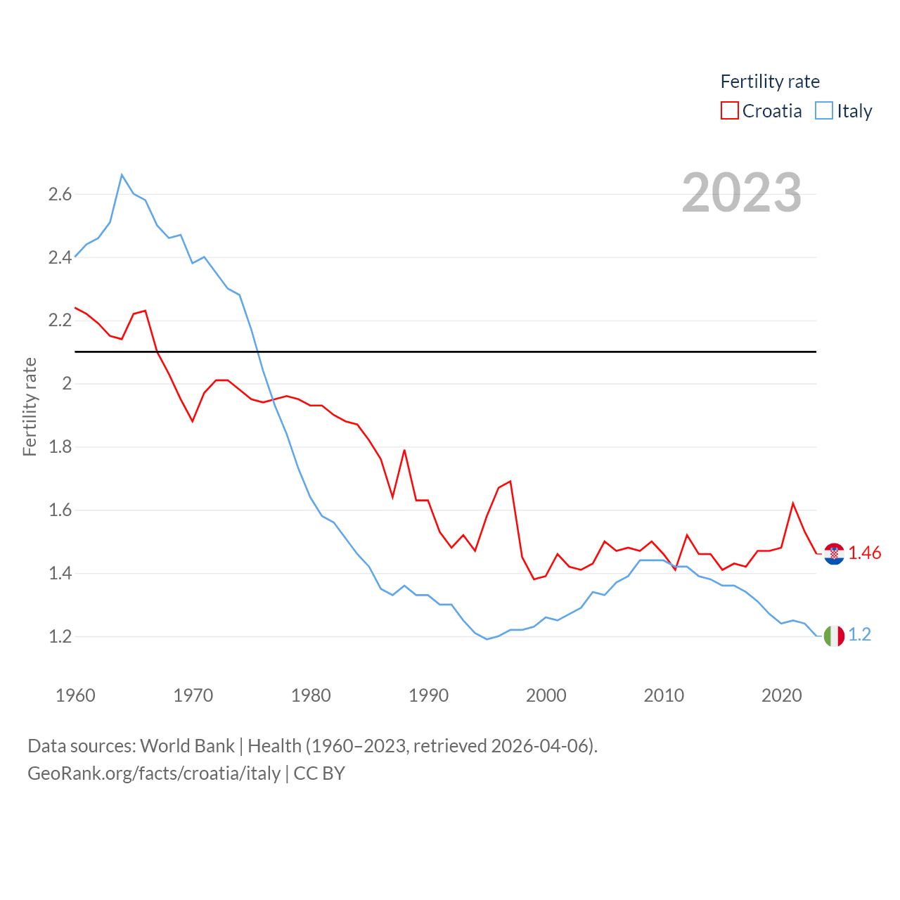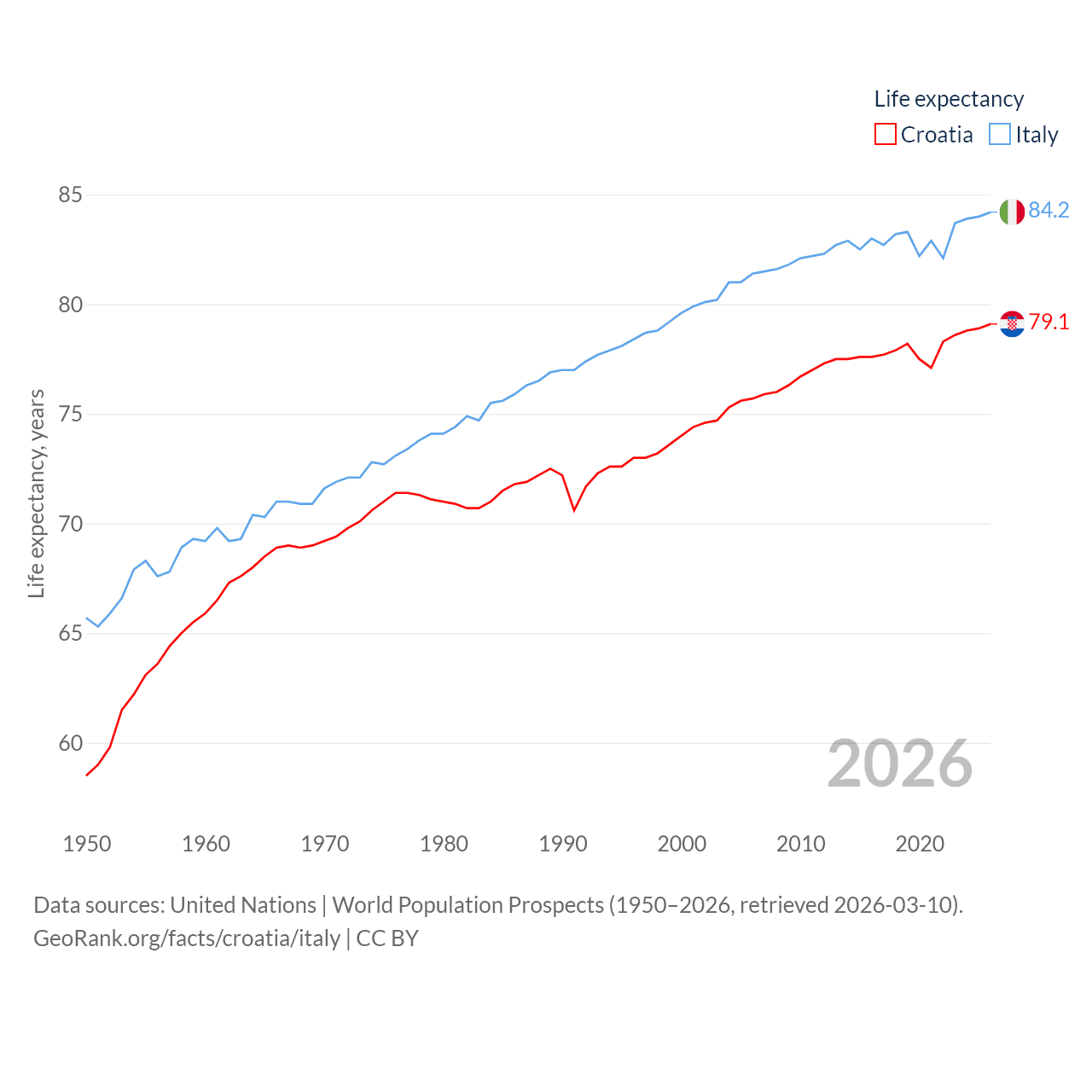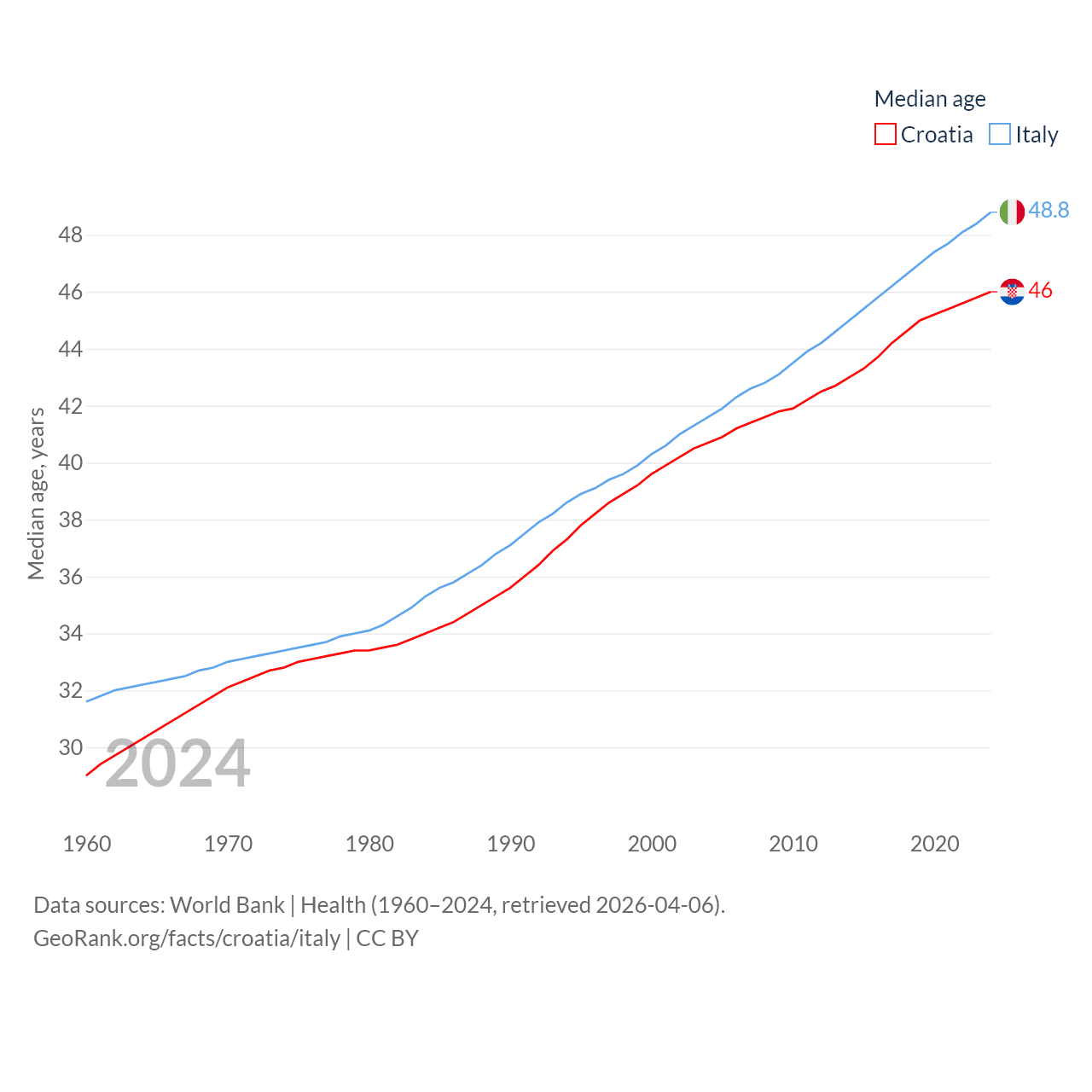 Croatia has a population of 3.87M (ranked 129/197), compared with 59M in Italy (ranked 25/197). Croatia's land area is 21,606 sq mi versus 114,178 sq mi for Italy (ranked 123rd vs. 72nd).