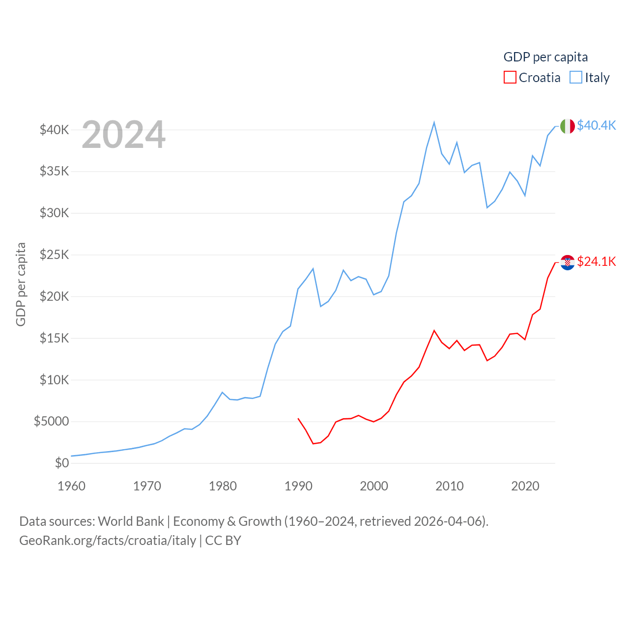 By GDP, Croatia ranks 75/197 ($93B) and Italy ranks 8/197 ($2.38T). By GDP per capita, Croatia ranks 50/197 ($24,050), while Italy ranks 29/197 ($40,385).