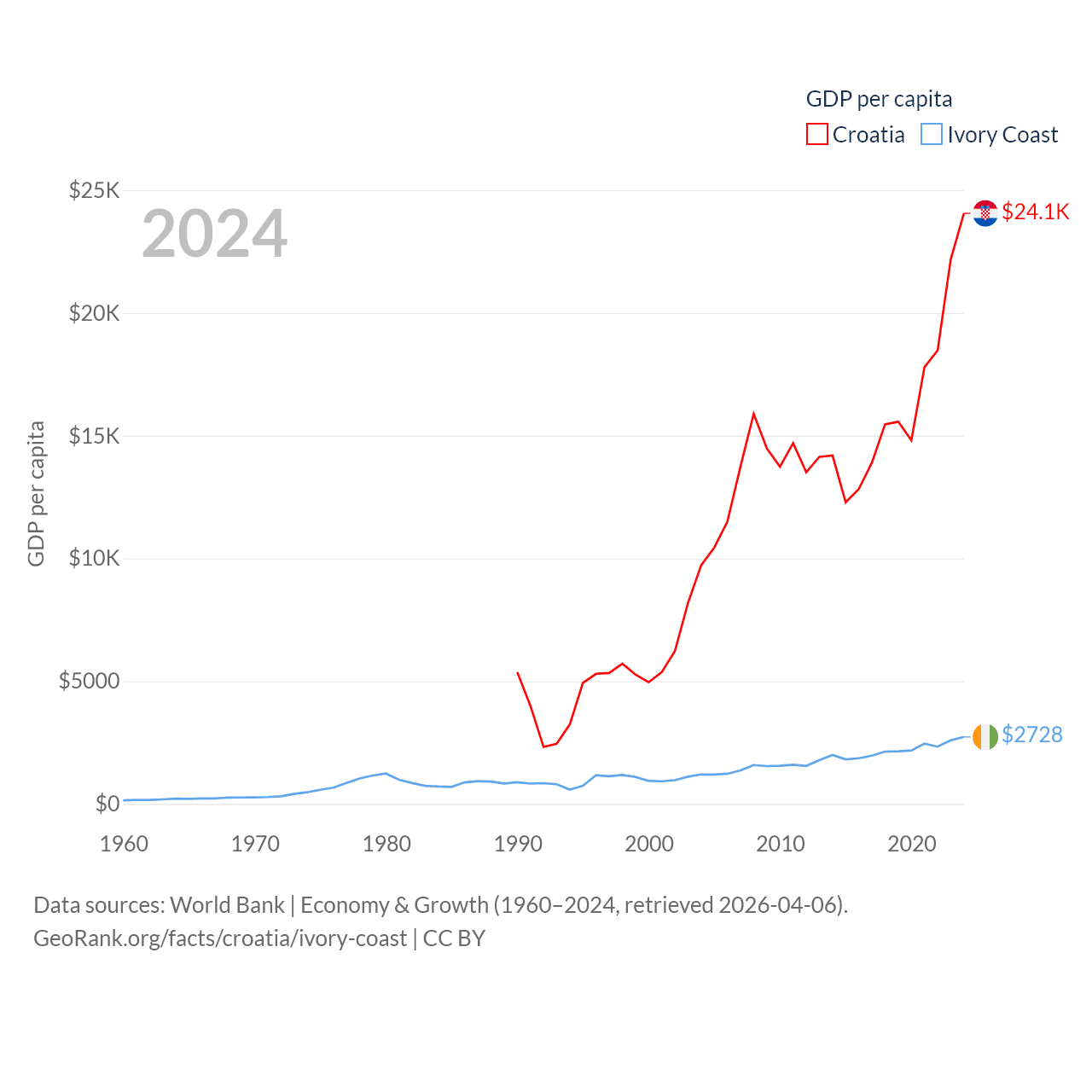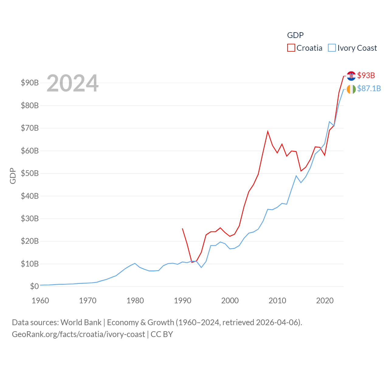 By GDP, Croatia ranks 75/197 ($93B) and Ivory Coast ranks 77/197 ($87.1B). By GDP per capita, Croatia ranks 50/197 ($24,050), while Ivory Coast ranks 142/197 ($2,728).