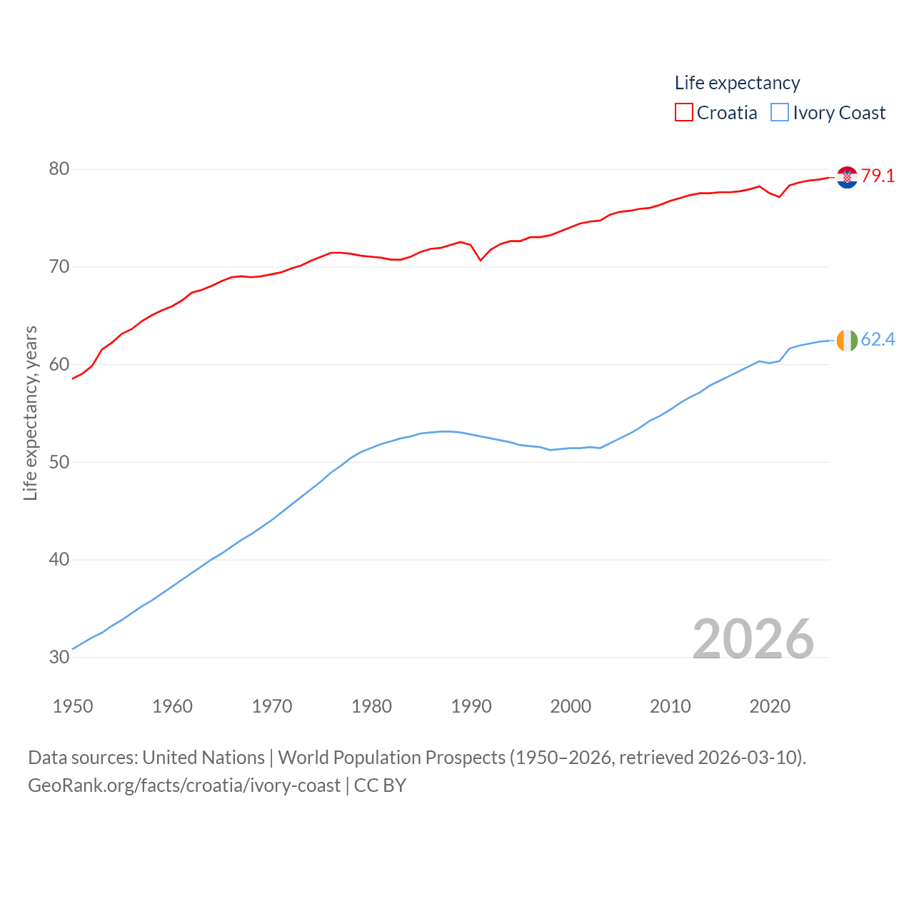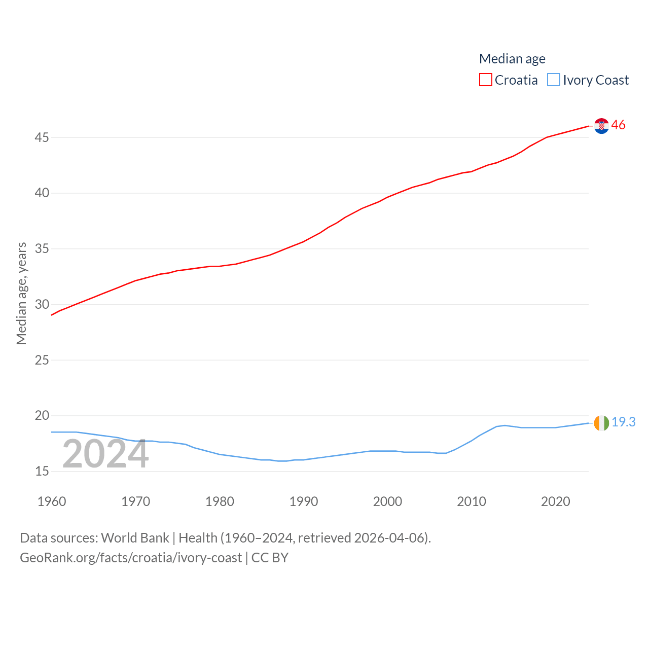 Croatia has a population of 3.87M (ranked 129/197), compared with 31.9M in Ivory Coast (ranked 50/197). Croatia's land area is 21,606 sq mi versus 122,780 sq mi for Ivory Coast (ranked 123rd vs. 66th).