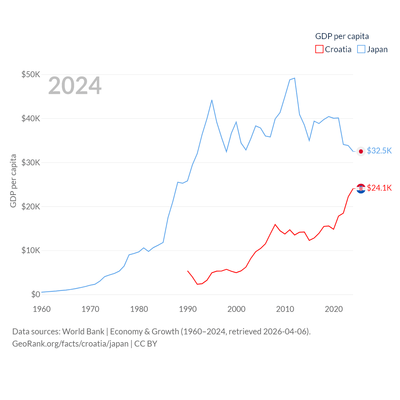 By GDP, Croatia ranks 75/197 ($93B) and Japan ranks 4/197 ($4.03T). By GDP per capita, Croatia ranks 50/197 ($24,050), while Japan ranks 38/197 ($32,487).