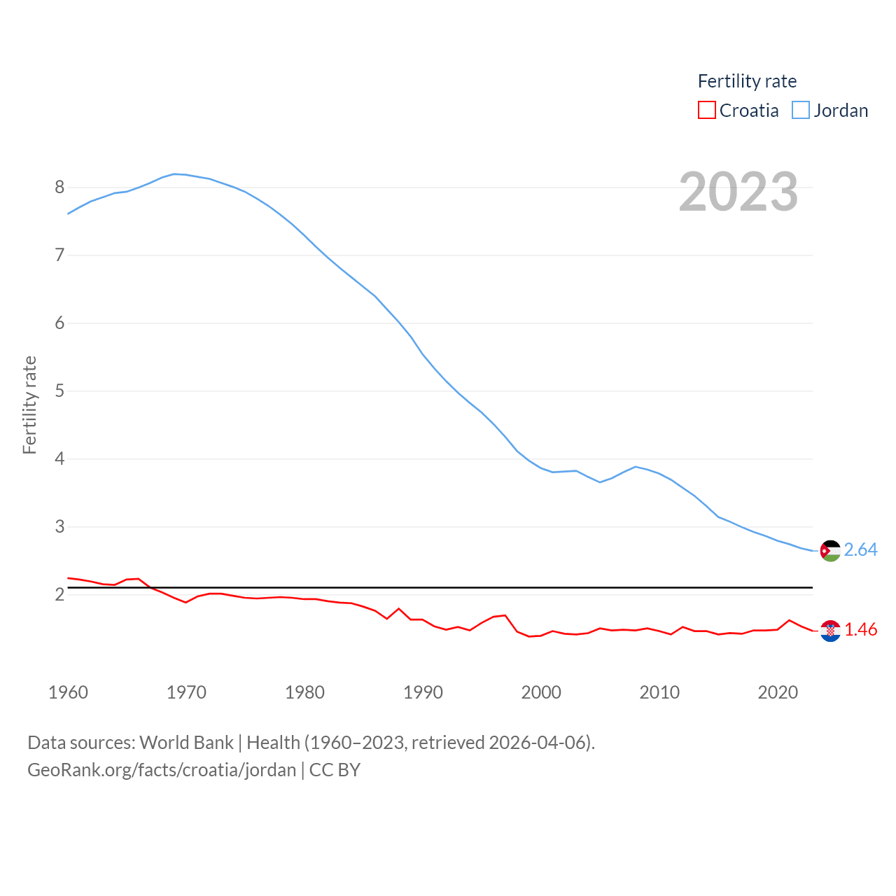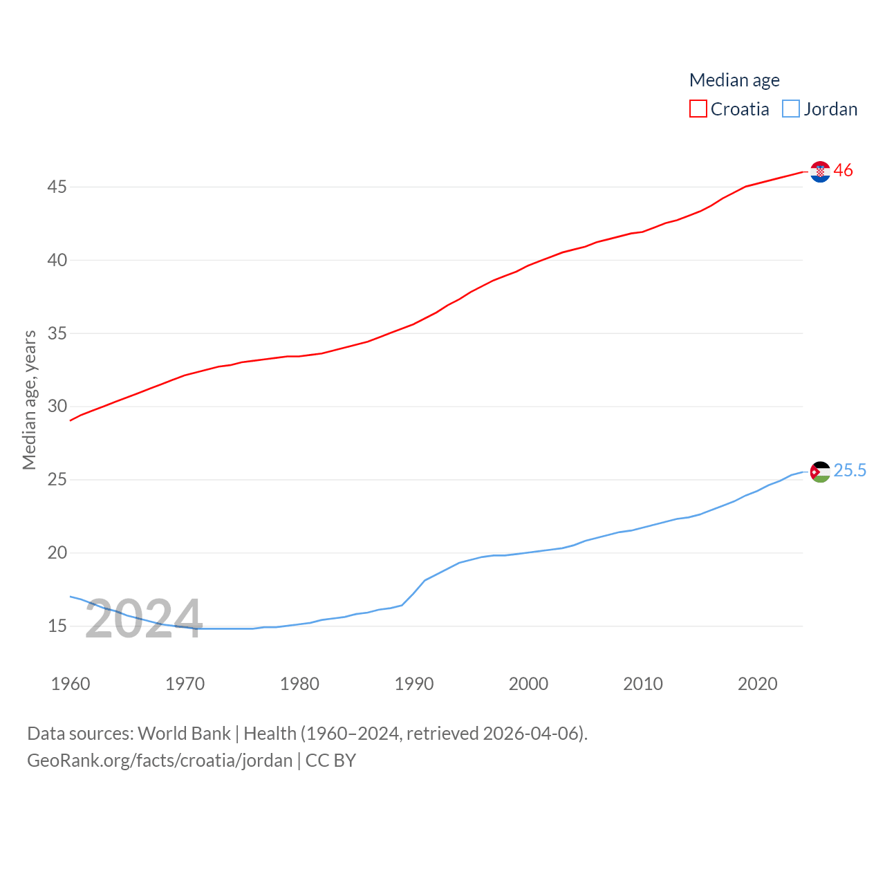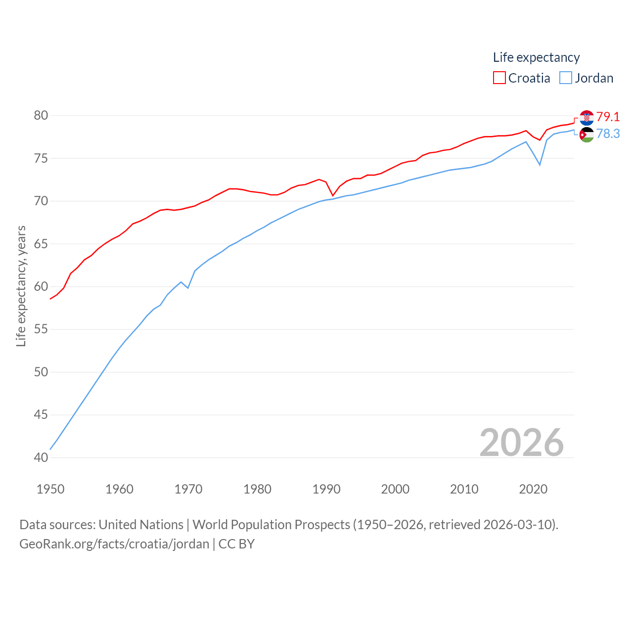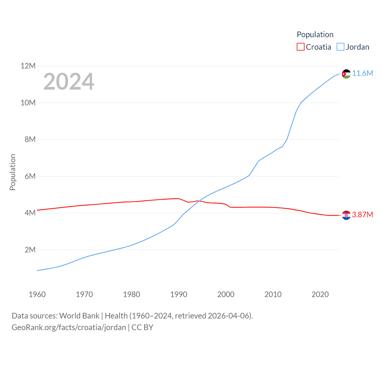 Croatia has a population of 3.87M (ranked 129/197), compared with 11.6M in Jordan (ranked 84/197). Croatia's land area is 21,606 sq mi versus 34,284 sq mi for Jordan (ranked 123rd vs. 110th).