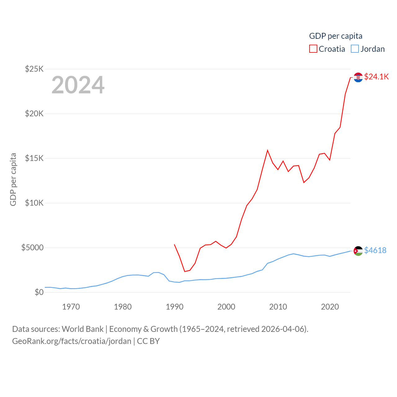 By GDP, Croatia ranks 75/197 ($93B) and Jordan ranks 90/197 ($53.4B). By GDP per capita, Croatia ranks 50/197 ($24,050), while Jordan ranks 123/197 ($4,618).