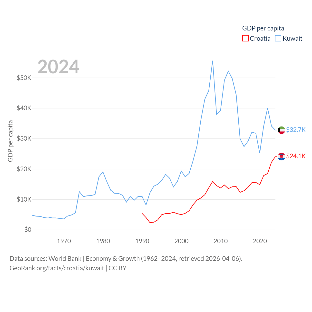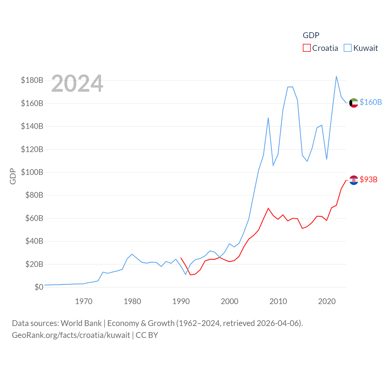 By GDP, Croatia ranks 75/197 ($93B) and Kuwait ranks 59/197 ($160B). By GDP per capita, Croatia ranks 50/197 ($24,050), while Kuwait ranks 37/197 ($32,718).
