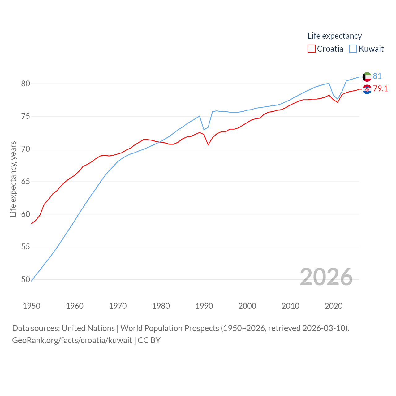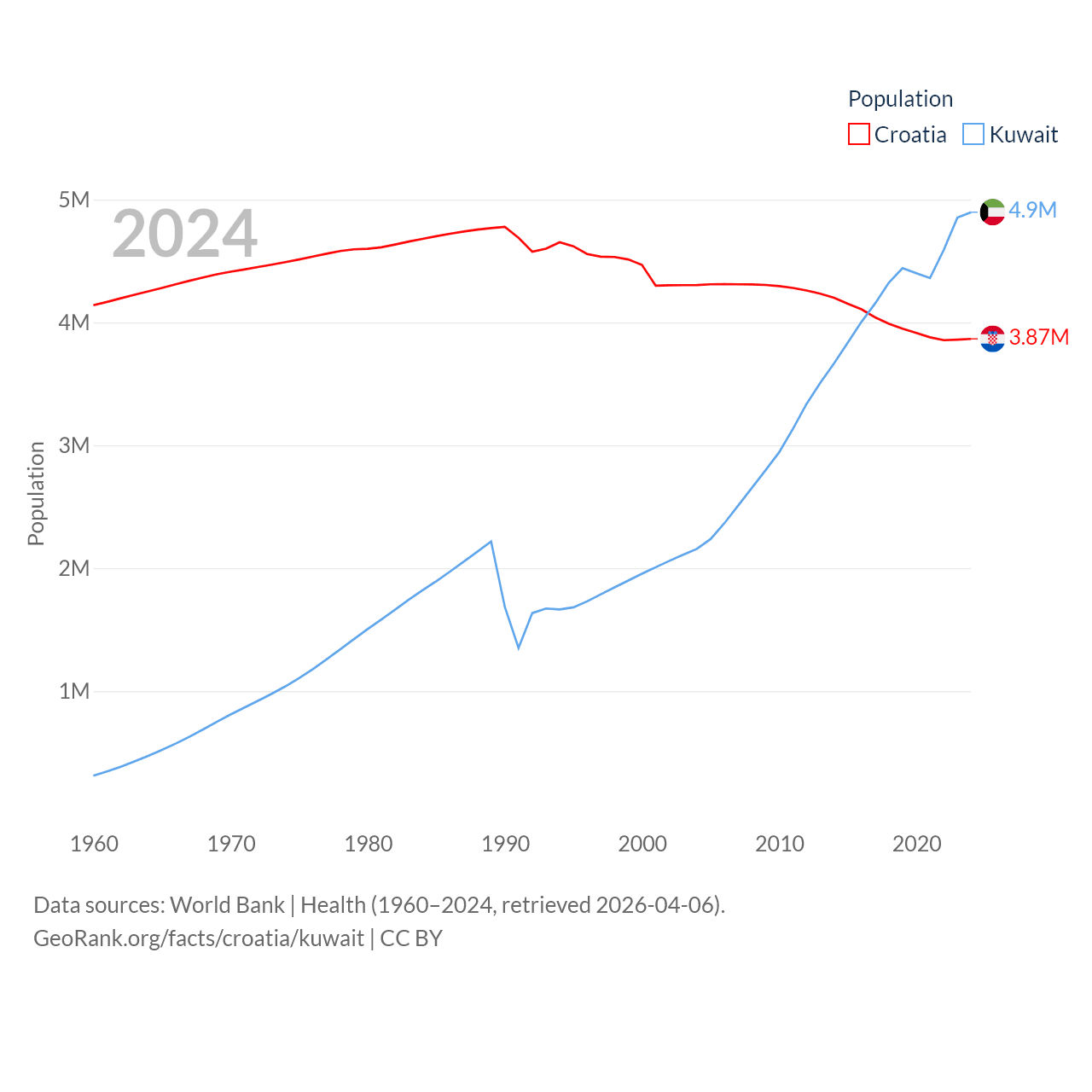 Croatia has a population of 3.87M (ranked 129/197), compared with 4.9M in Kuwait (ranked 127/197). Croatia's land area is 21,606 sq mi versus 6,880 sq mi for Kuwait (ranked 123rd vs. 153rd).