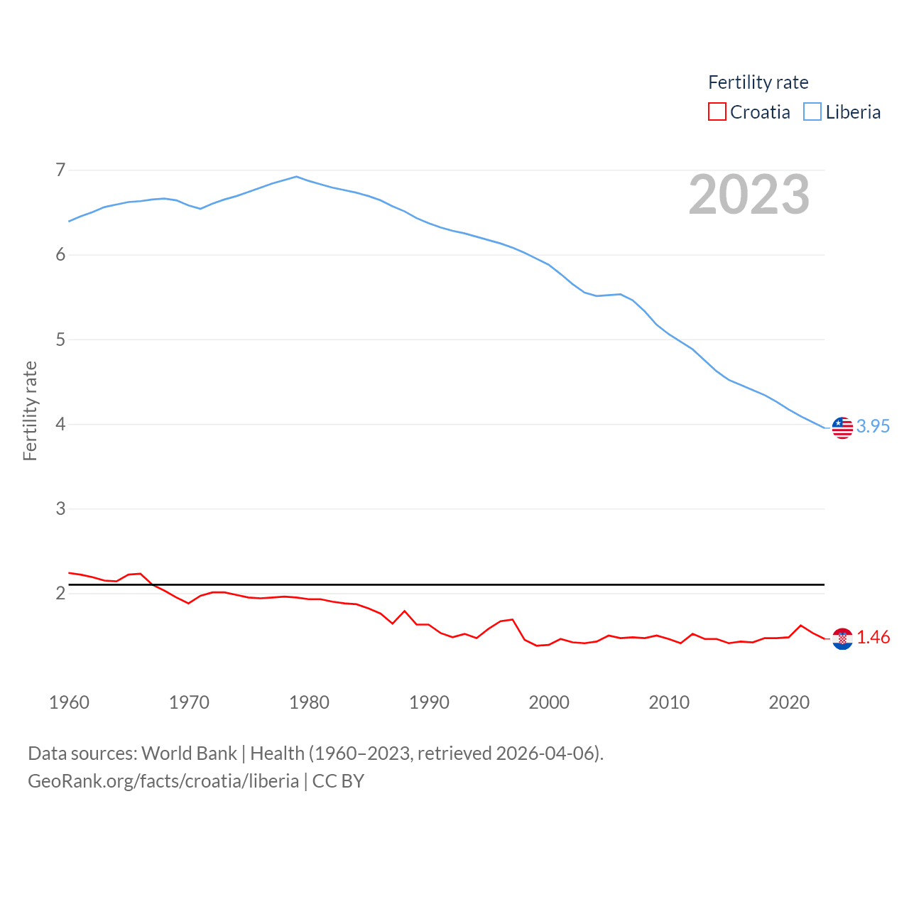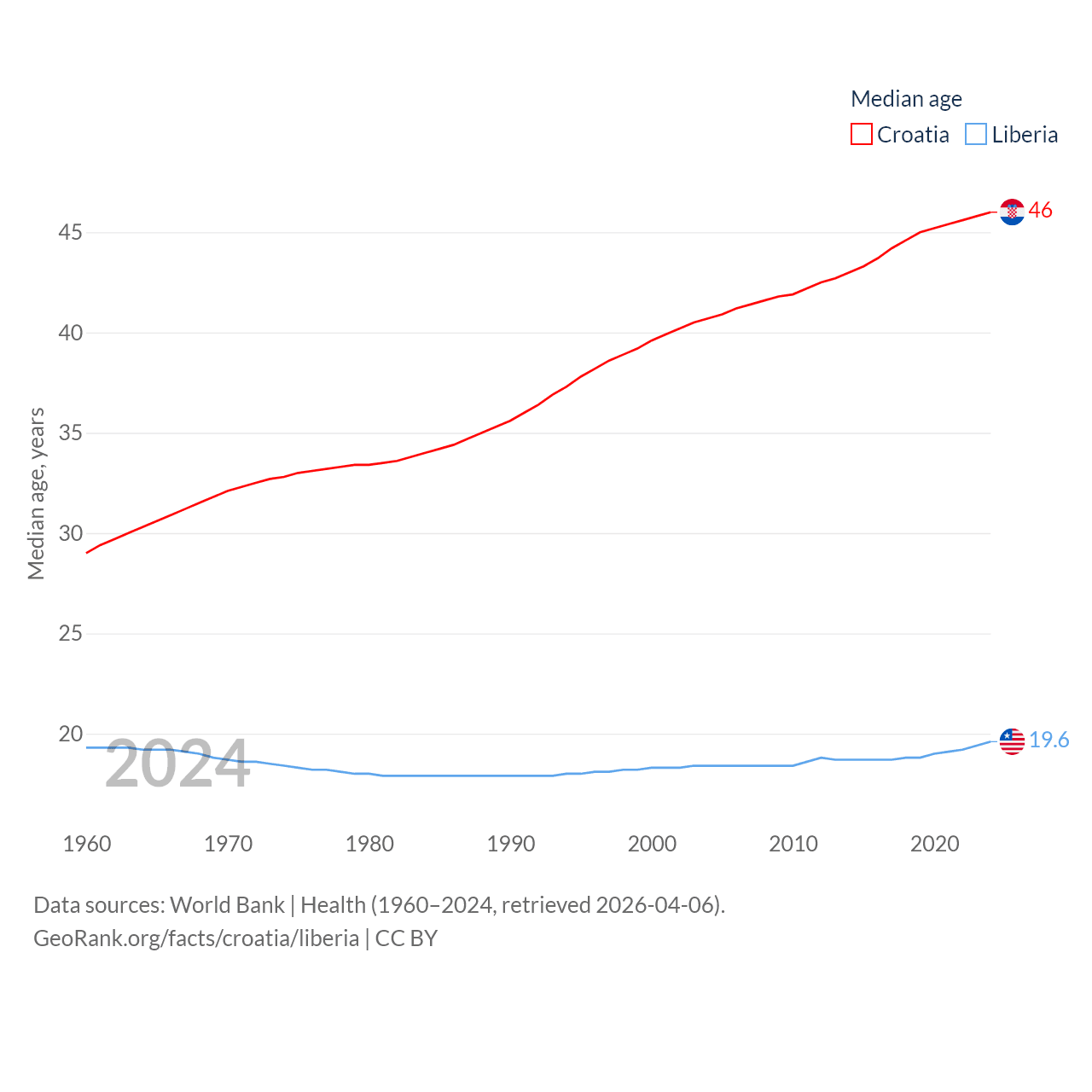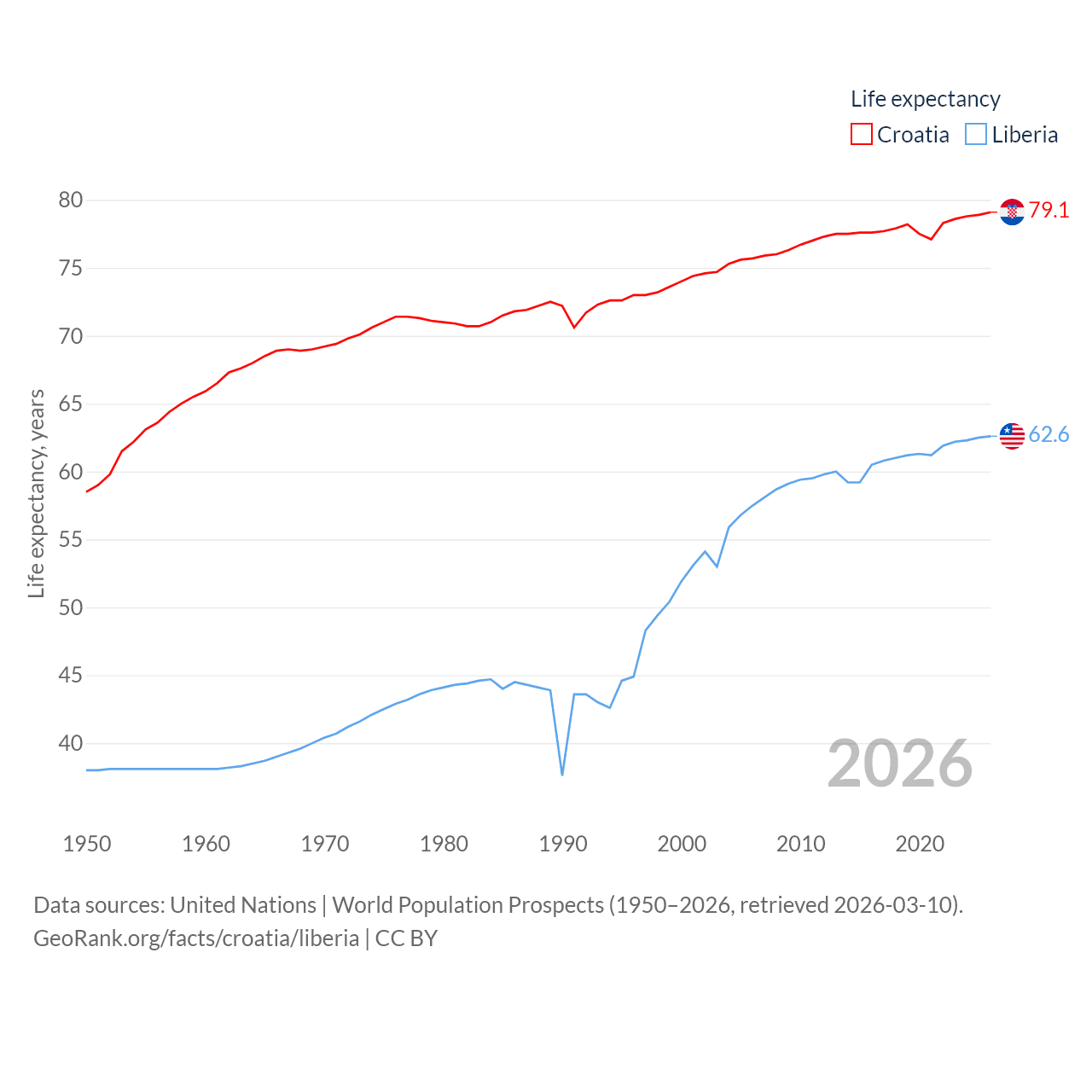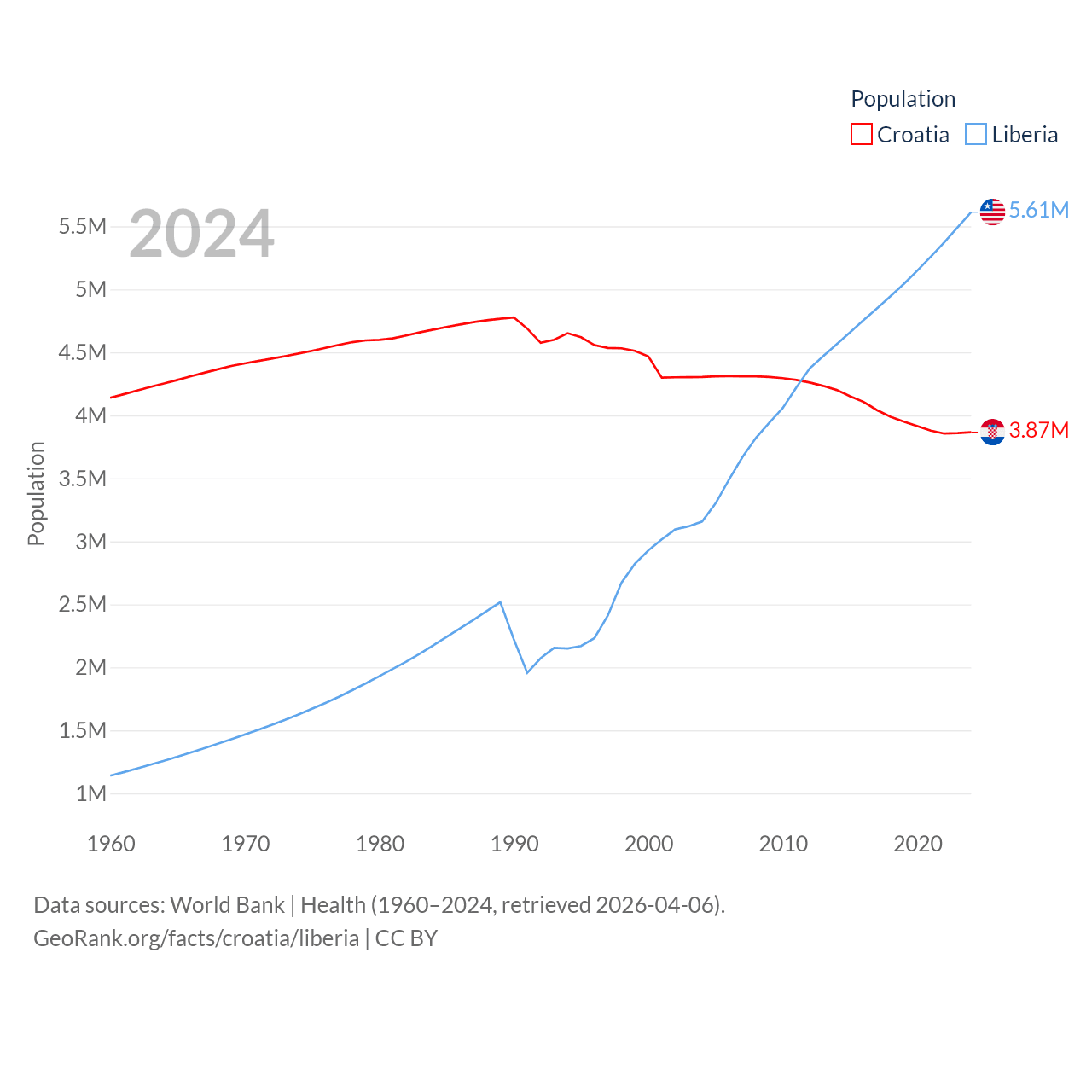 Croatia has a population of 3.87M (ranked 129/197), compared with 5.61M in Liberia (ranked 117/197). Croatia's land area is 21,606 sq mi versus 37,189 sq mi for Liberia (ranked 123rd vs. 106th).