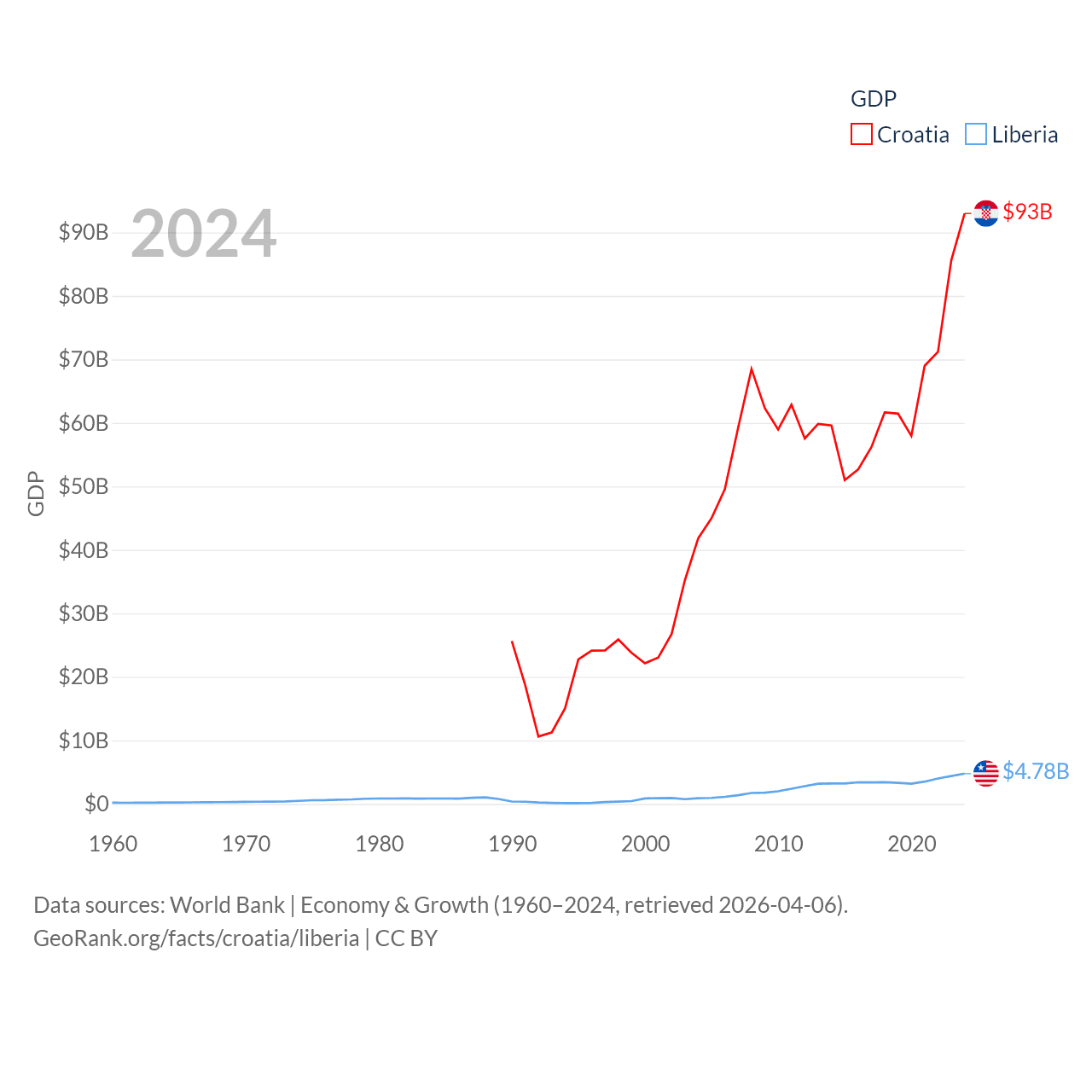 By GDP, Croatia ranks 75/197 ($93B) and Liberia ranks 163/197 ($4.78B). By GDP per capita, Croatia ranks 50/197 ($24,050), while Liberia ranks 184/197 ($851).