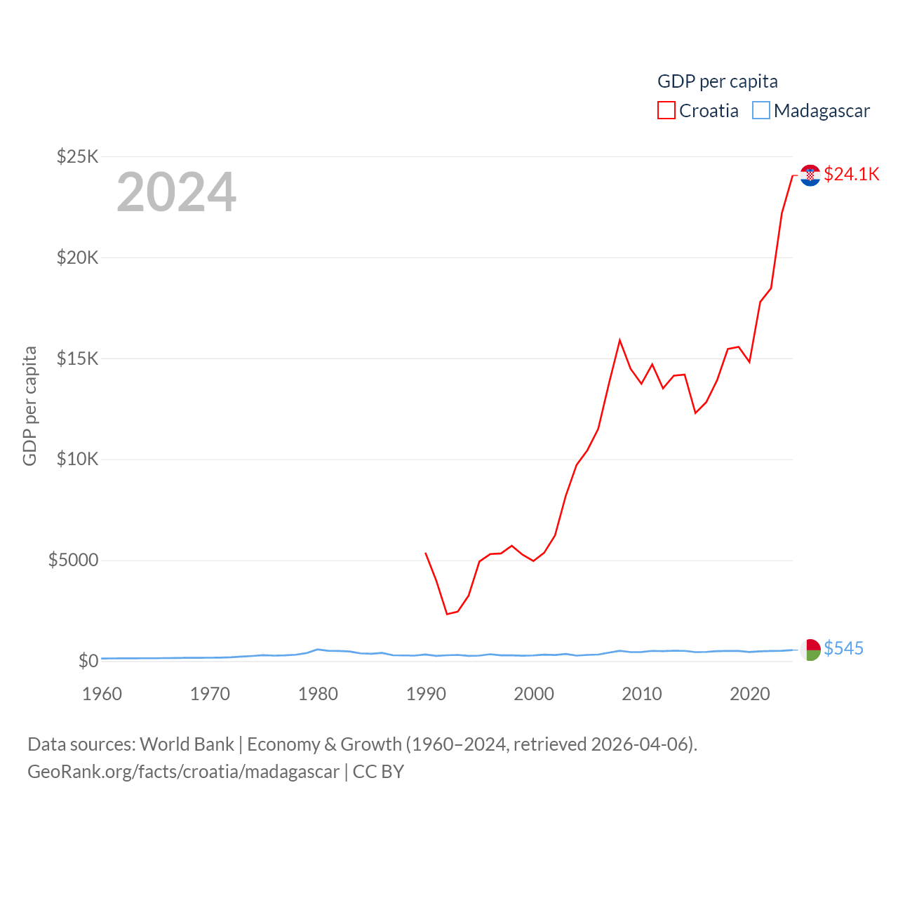 By GDP, Croatia ranks 75/197 ($93B) and Madagascar ranks 136/197 ($17.4B). By GDP per capita, Croatia ranks 50/197 ($24,050), while Madagascar ranks 193/197 ($545).