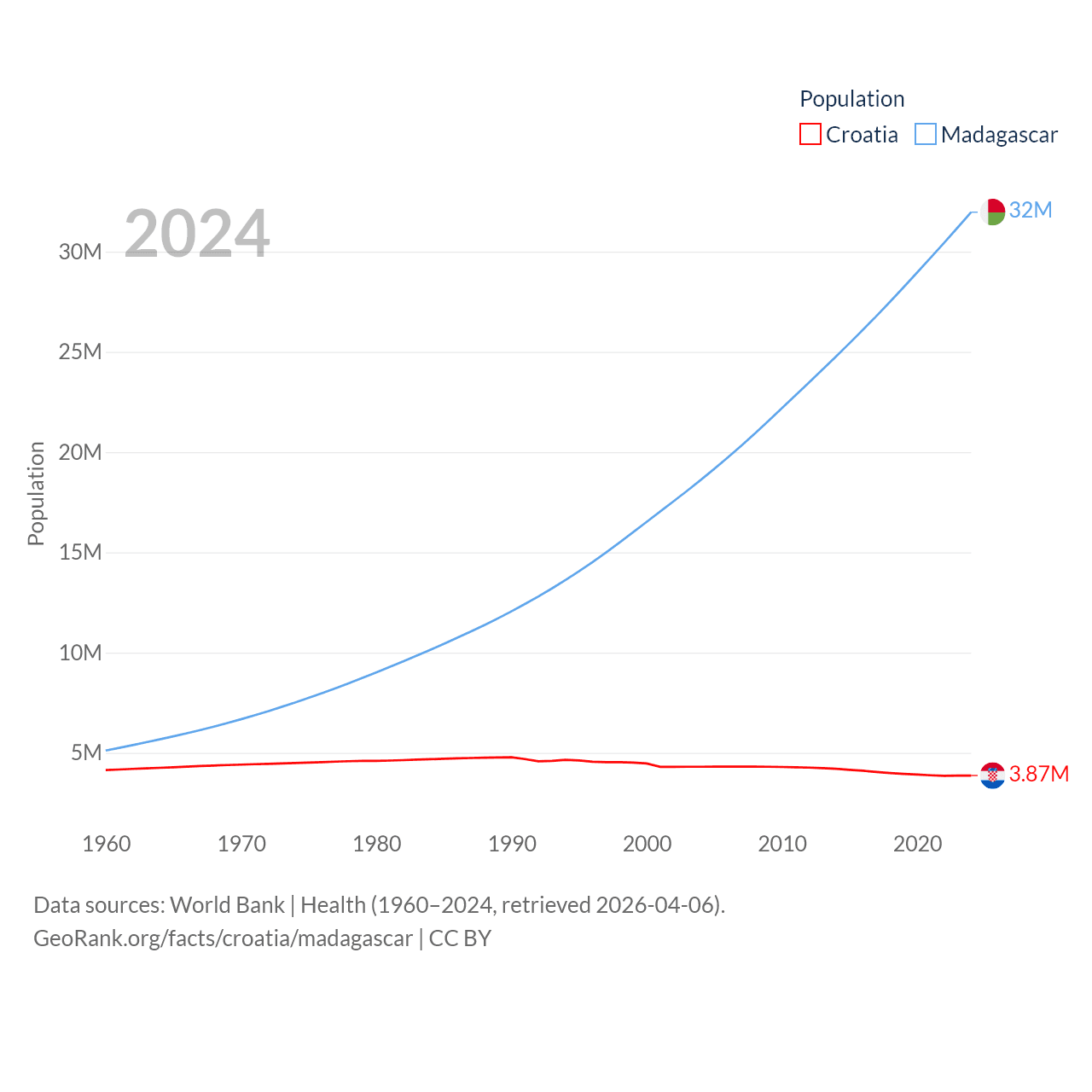 Croatia has a population of 3.87M (ranked 129/197), compared with 32M in Madagascar (ranked 49/197). Croatia's land area is 21,606 sq mi versus 224,634 sq mi for Madagascar (ranked 123rd vs. 44th).