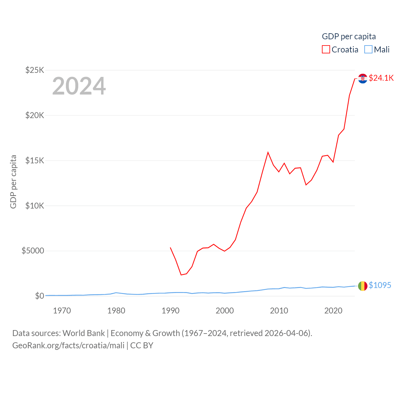 By GDP, Croatia ranks 75/197 ($93B) and Mali ranks 113/197 ($26.8B). By GDP per capita, Croatia ranks 50/197 ($24,050), while Mali ranks 173/197 ($1,095).