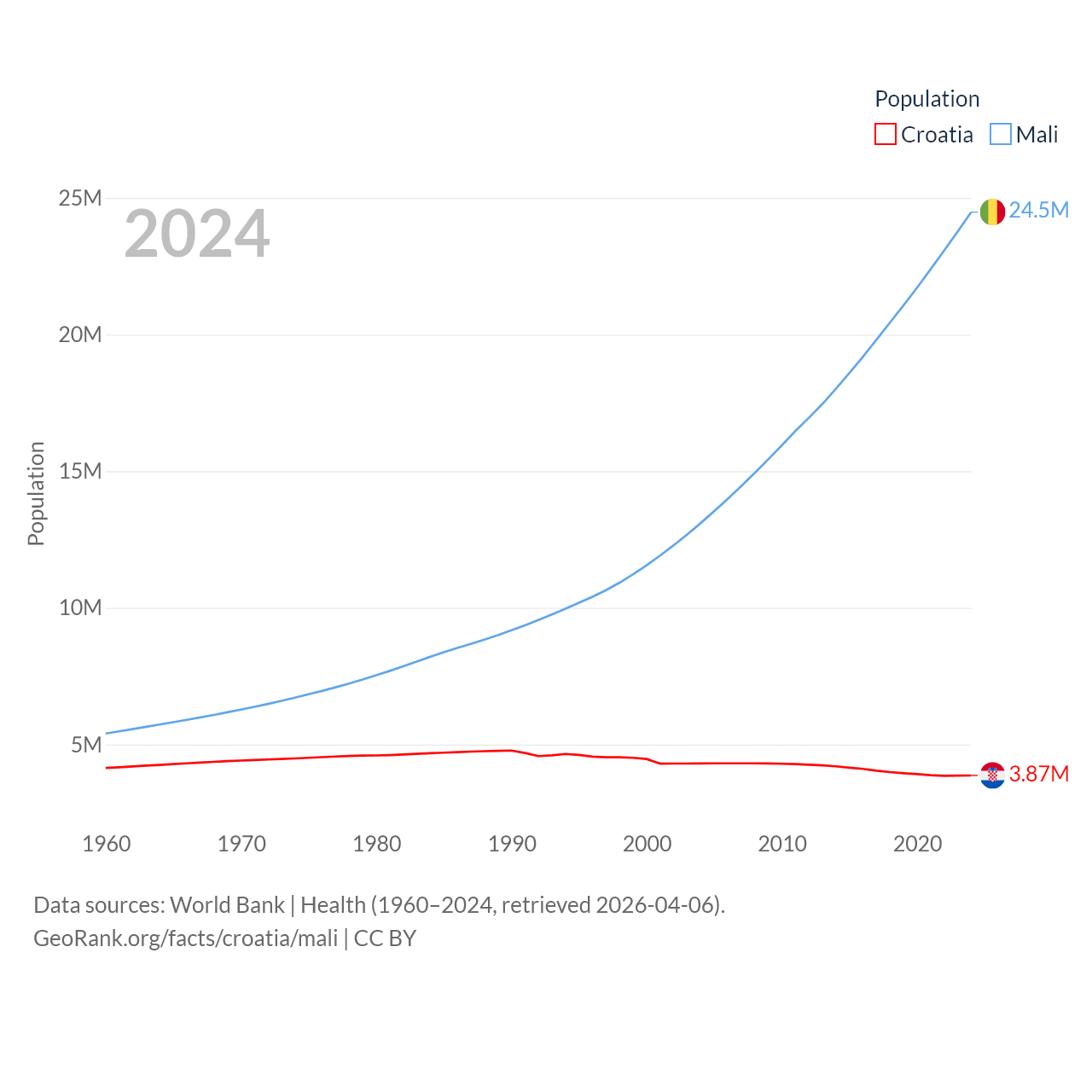 Croatia has a population of 3.87M (ranked 129/197), compared with 24.5M in Mali (ranked 58/197). Croatia's land area is 21,606 sq mi versus 471,118 sq mi for Mali (ranked 123rd vs. 23rd).