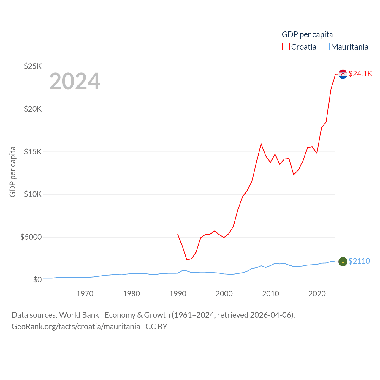 By GDP, Croatia ranks 75/197 ($93B) and Mauritania ranks 153/197 ($10.9B). By GDP per capita, Croatia ranks 50/197 ($24,050), while Mauritania ranks 156/197 ($2,110).