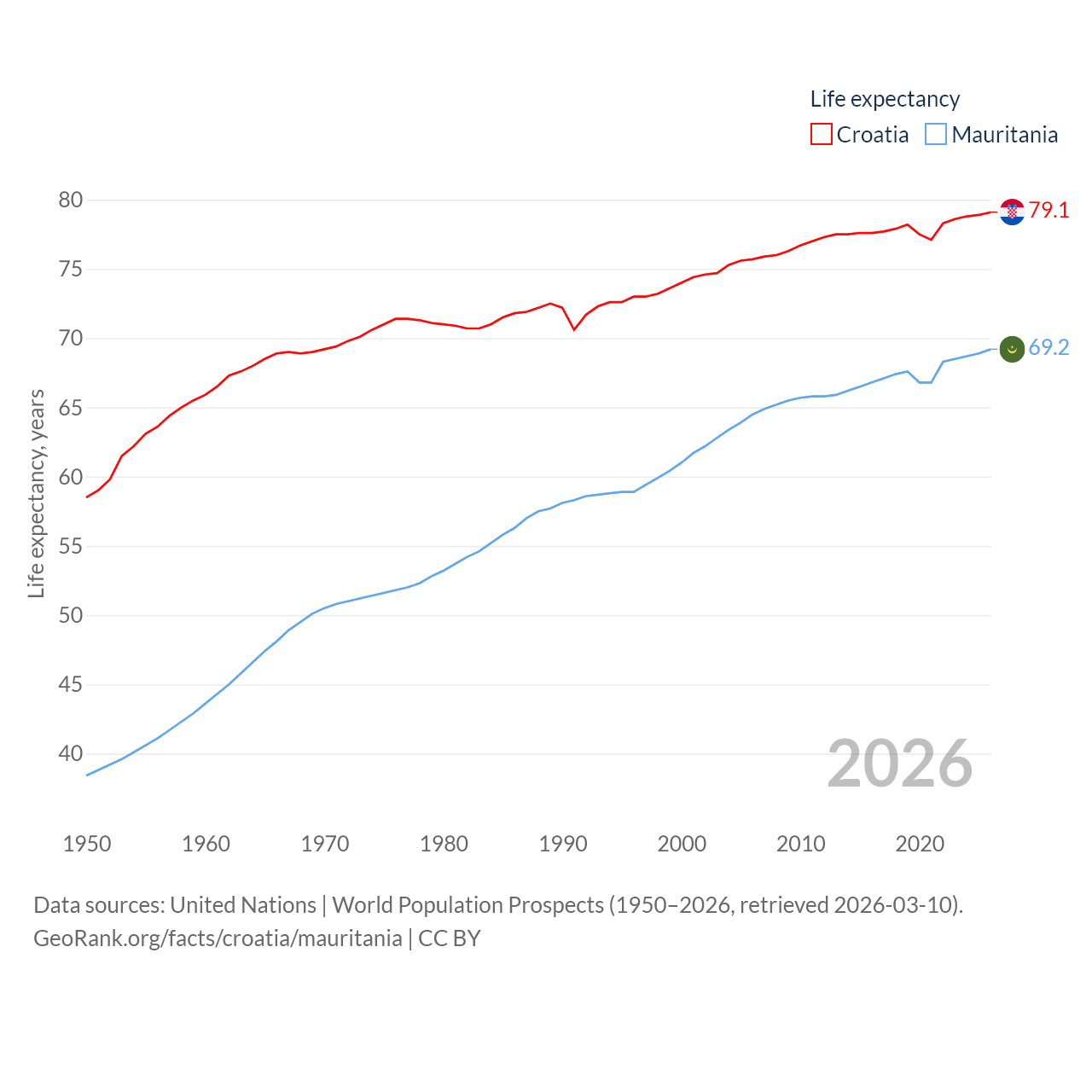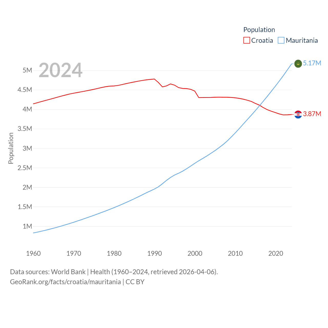 Croatia has a population of 3.87M (ranked 129/197), compared with 5.17M in Mauritania (ranked 125/197). Croatia's land area is 21,606 sq mi versus 397,955 sq mi for Mauritania (ranked 123rd vs. 28th).