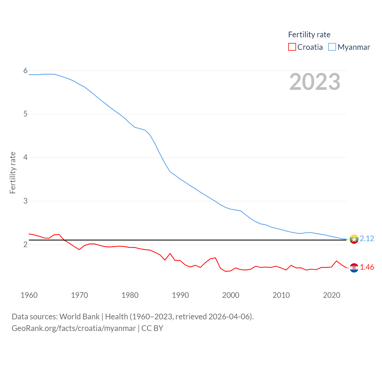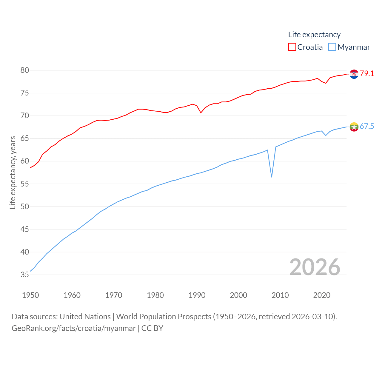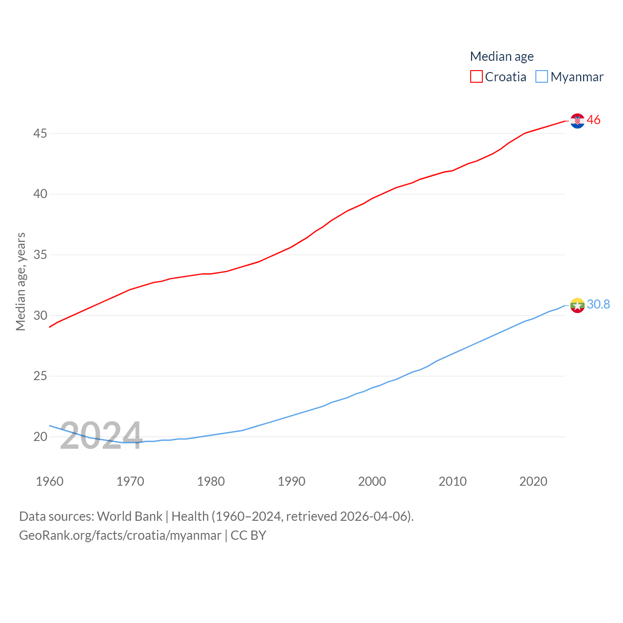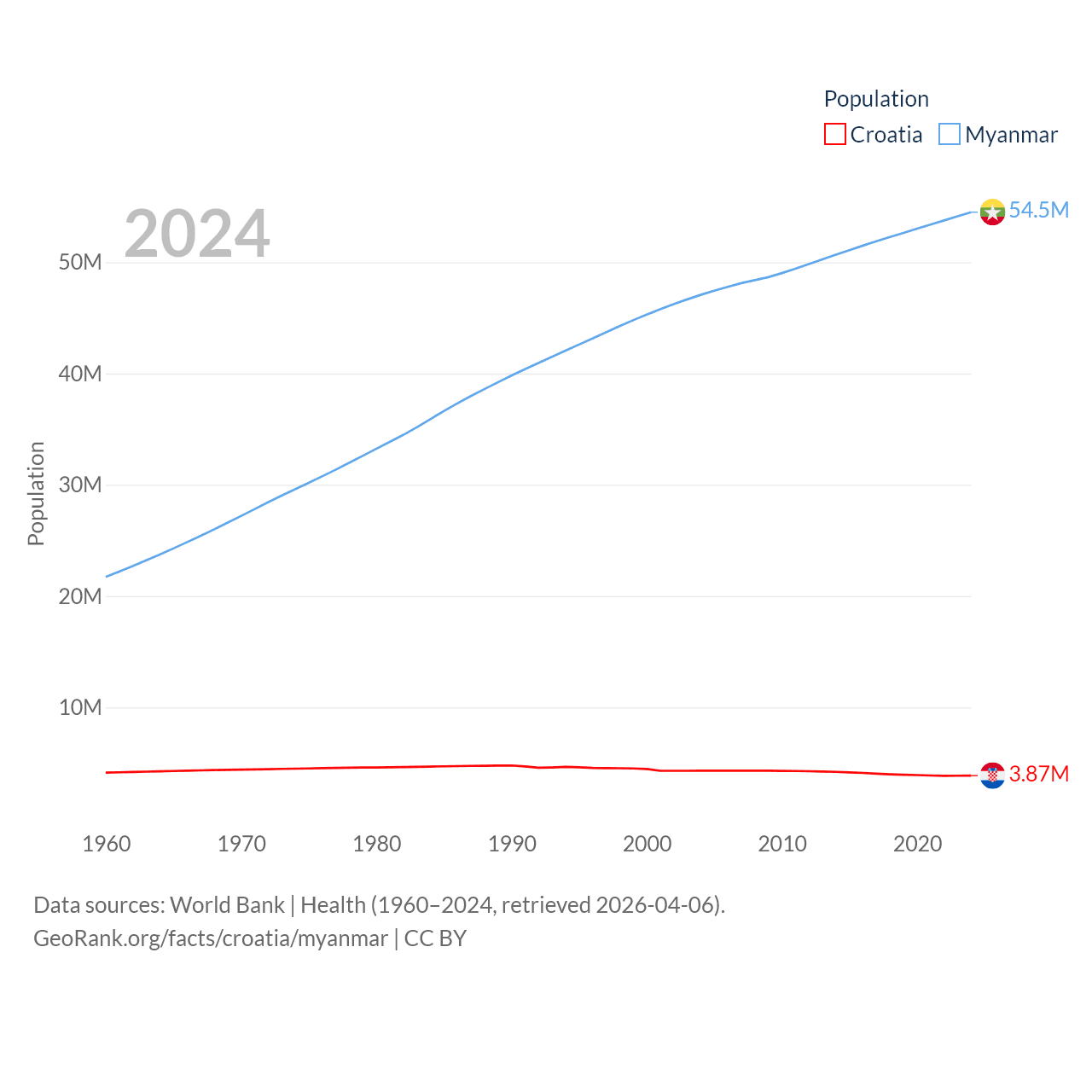 Croatia has a population of 3.87M (ranked 129/197), compared with 54.5M in Myanmar (ranked 27/197). Croatia's land area is 21,606 sq mi versus 251,997 sq mi for Myanmar (ranked 123rd vs. 39th).