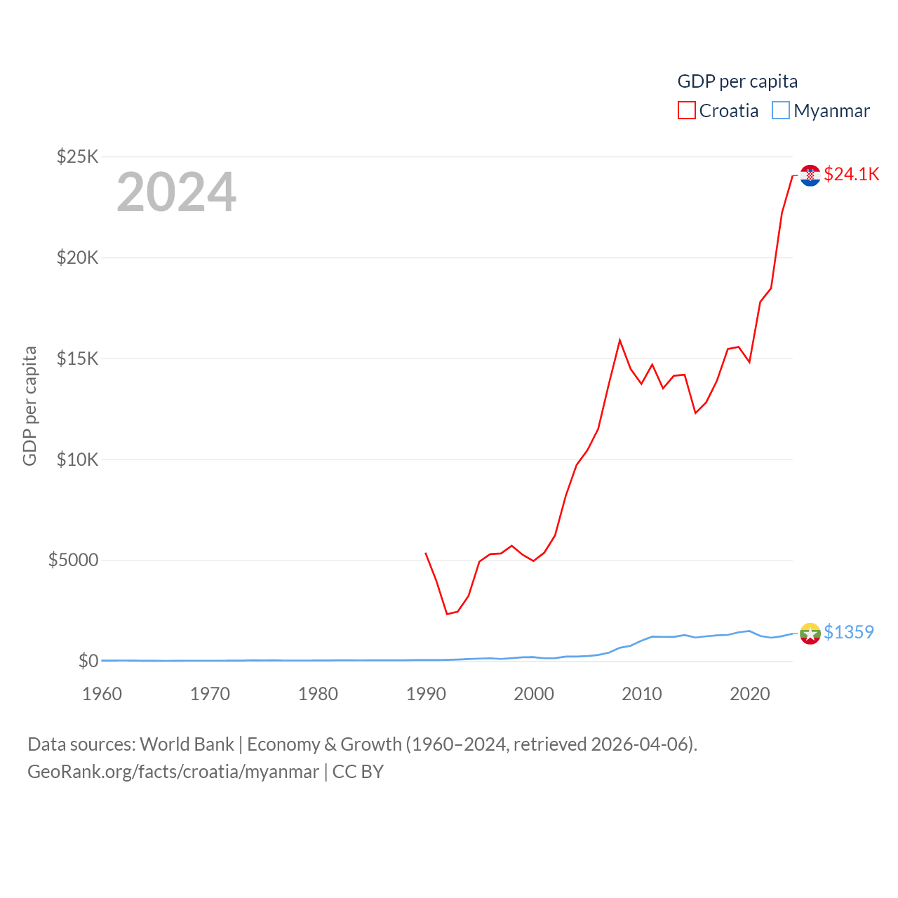 By GDP, Croatia ranks 75/197 ($93B) and Myanmar ranks 85/197 ($74.1B). By GDP per capita, Croatia ranks 50/197 ($24,050), while Myanmar ranks 165/197 ($1,359).