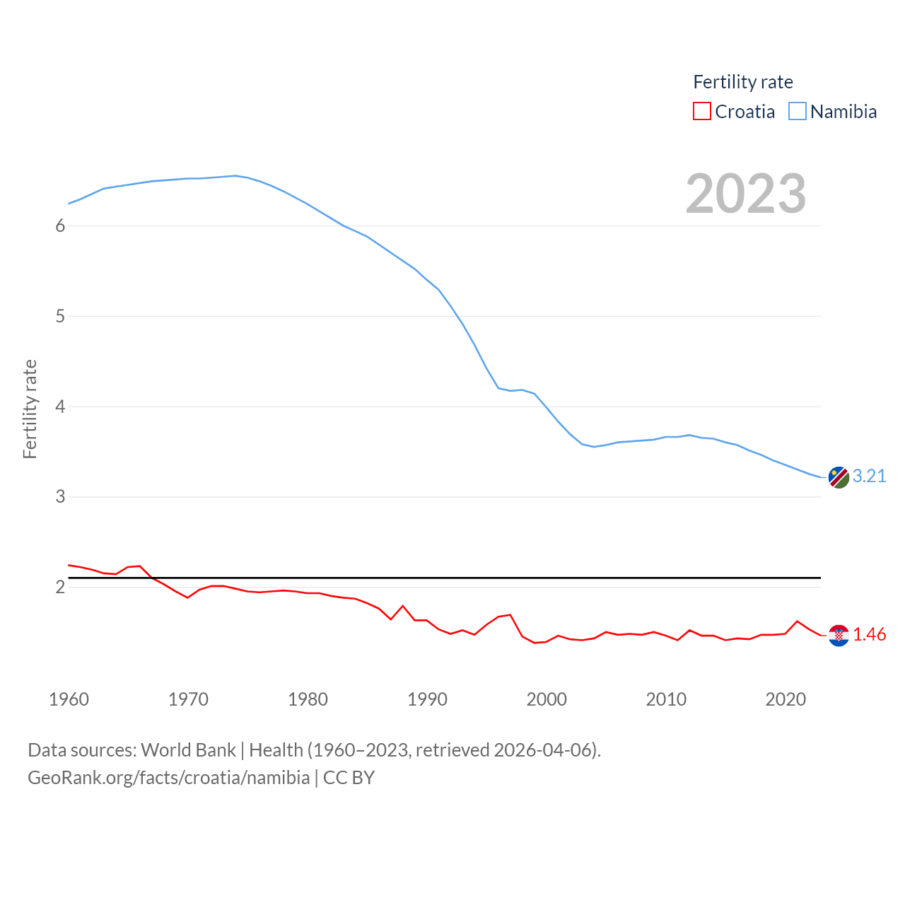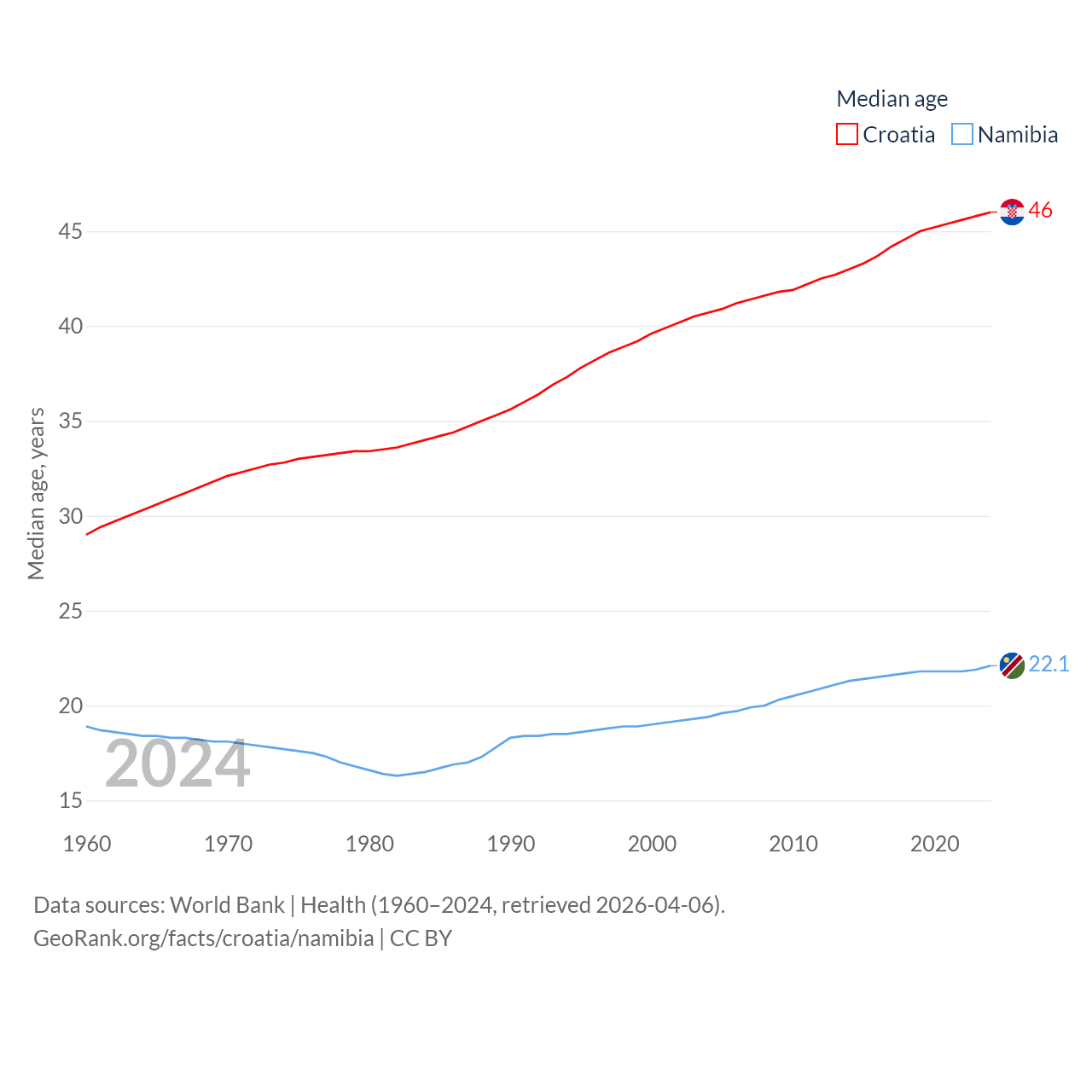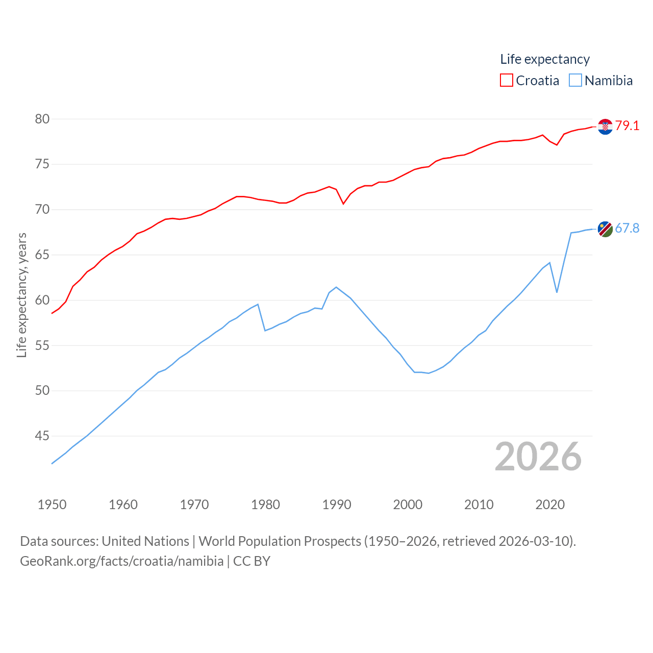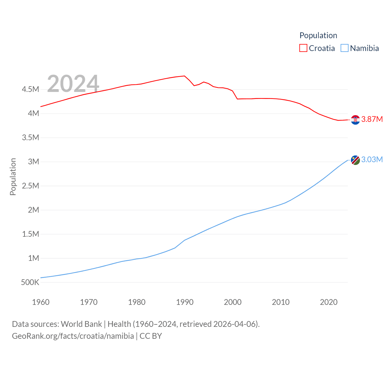 Croatia has a population of 3.87M (ranked 129/197), compared with 3.03M in Namibia (ranked 136/197). Croatia's land area is 21,606 sq mi versus 317,874 sq mi for Namibia (ranked 123rd vs. 33rd).