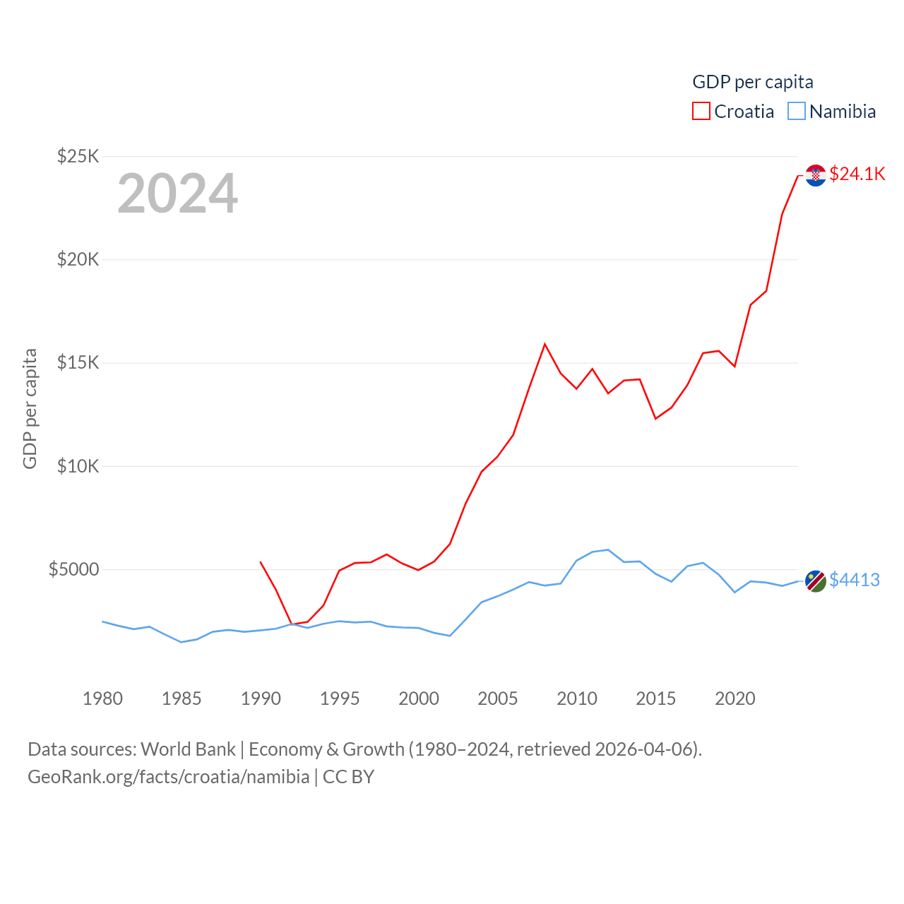 By GDP, Croatia ranks 75/197 ($93B) and Namibia ranks 147/197 ($13.4B). By GDP per capita, Croatia ranks 50/197 ($24,050), while Namibia ranks 126/197 ($4,413).