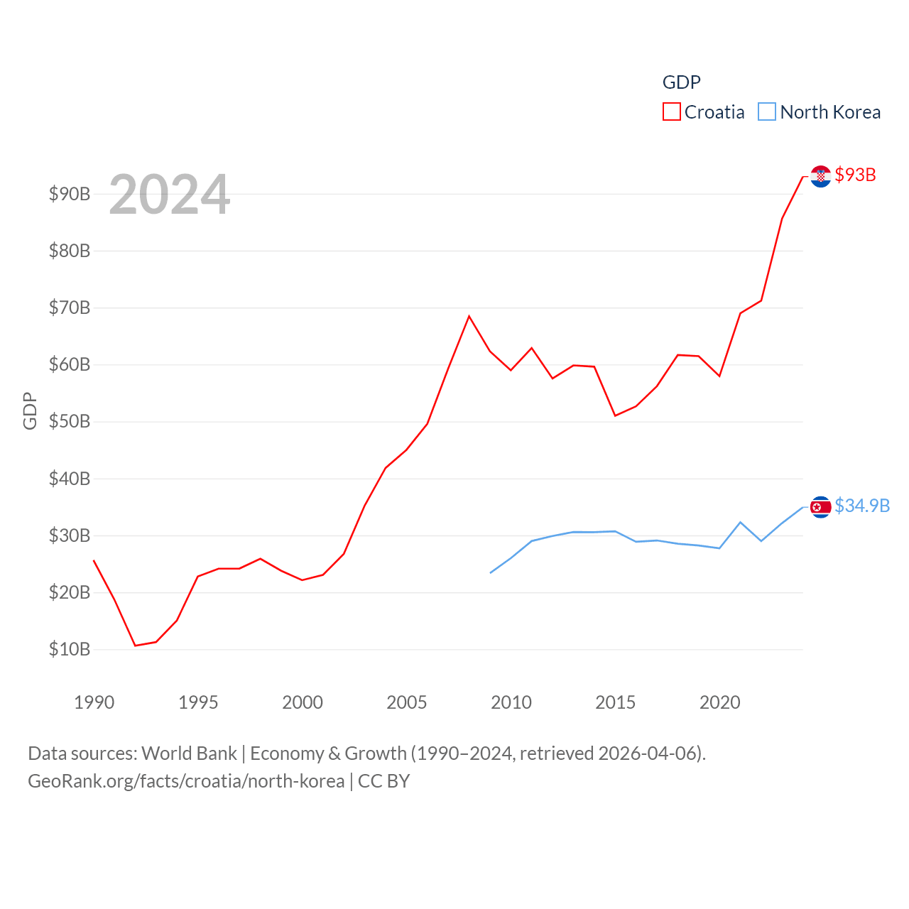 By GDP, Croatia ranks 75/197 ($93B) and North Korea ranks 106/197 ($34.9B). By GDP per capita, Croatia ranks 50/197 ($24,050), while North Korea ranks 168/197 ($1,319).