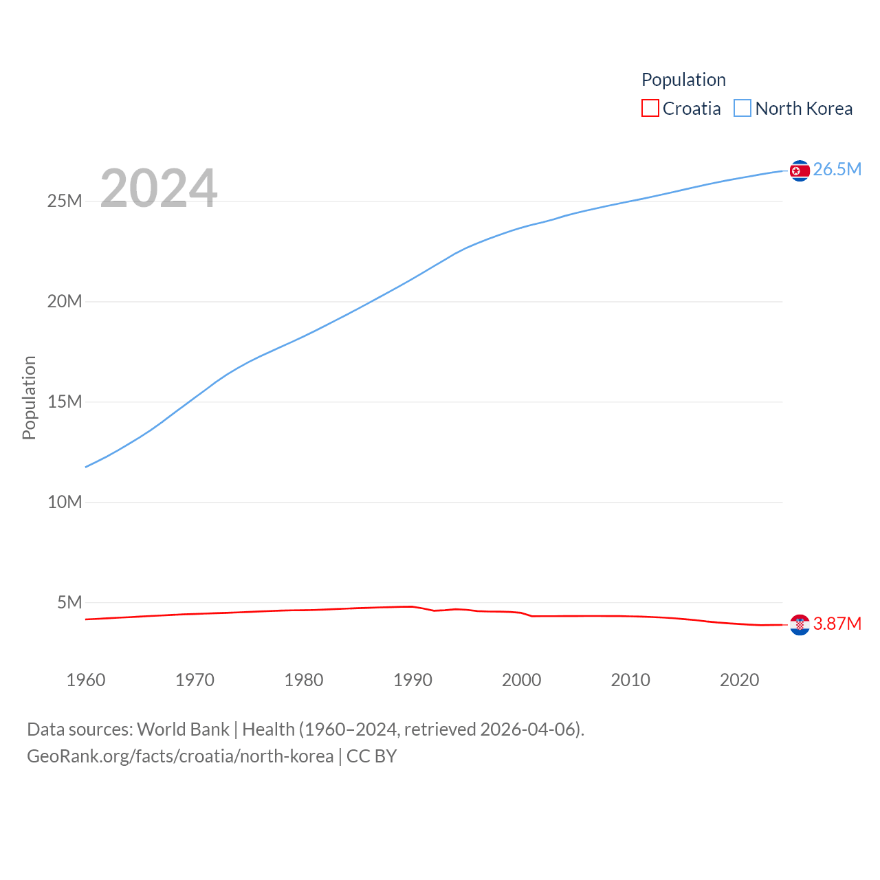 Croatia has a population of 3.87M (ranked 129/197), compared with 26.5M in North Korea (ranked 56/197). Croatia's land area is 21,606 sq mi versus 46,491 sq mi for North Korea (ranked 123rd vs. 97th).