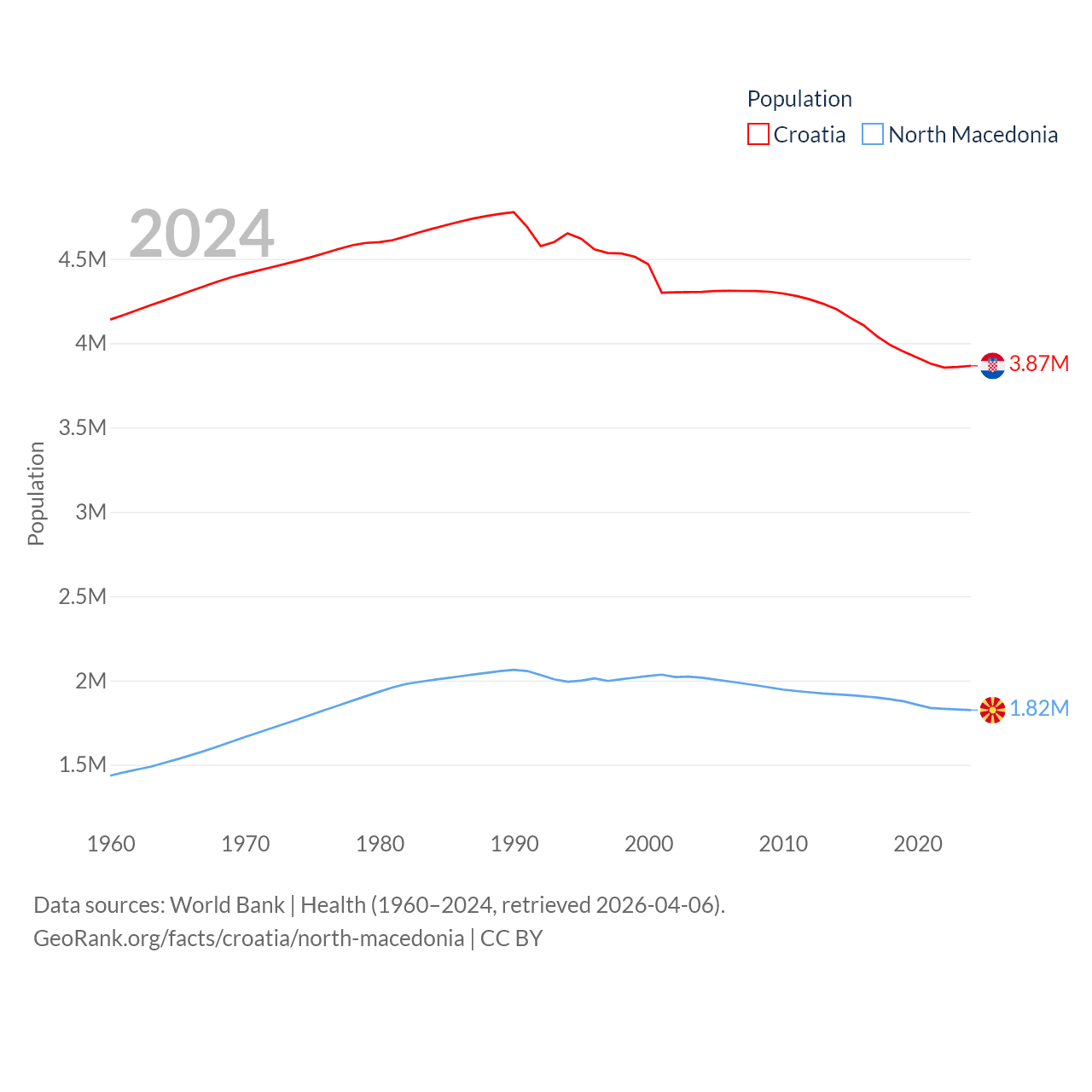 Croatia has a population of 3.87M (ranked 129/197), compared with 1.82M in North Macedonia (ranked 150/197). Croatia's land area is 21,606 sq mi versus 9,737 sq mi for North Macedonia (ranked 123rd vs. 145th).