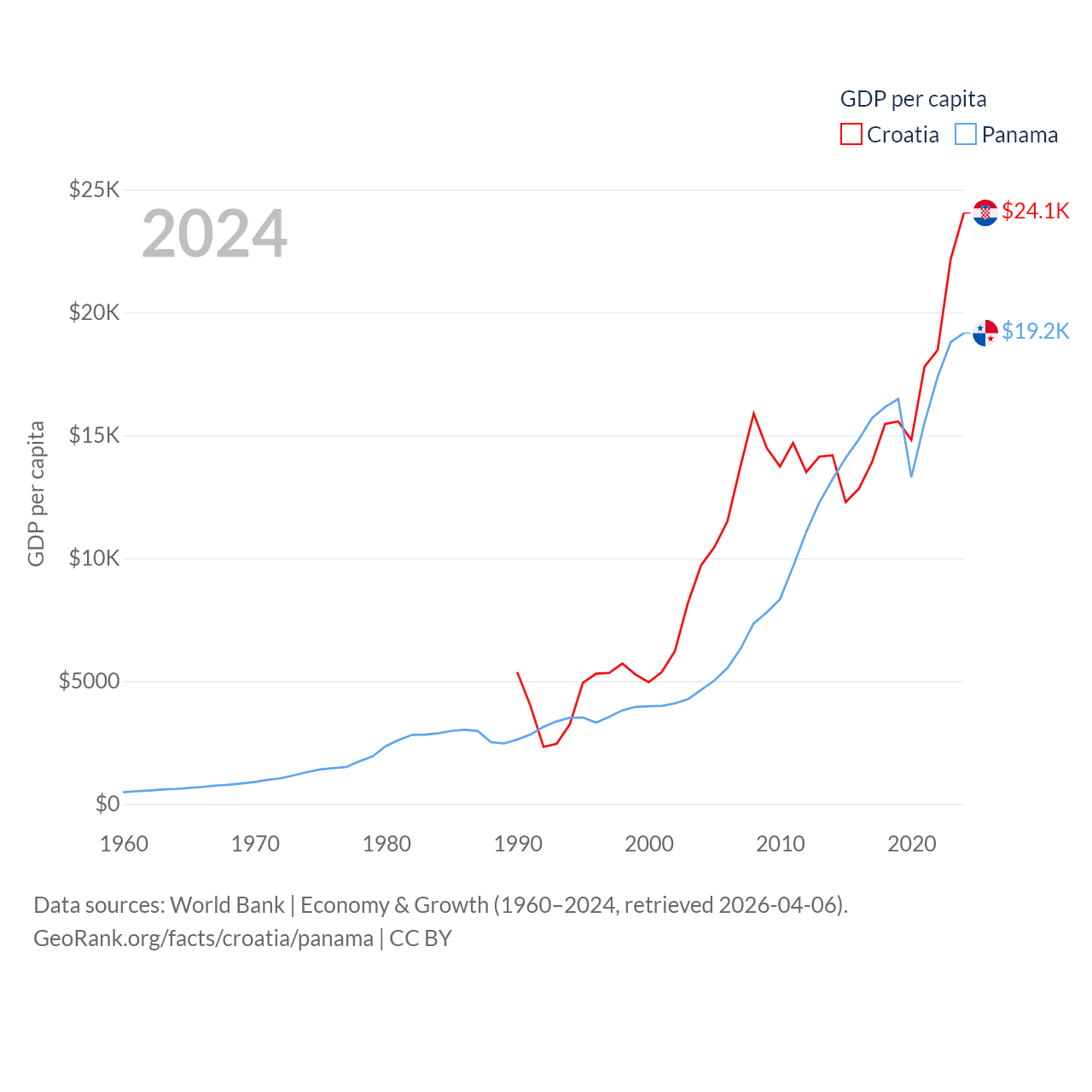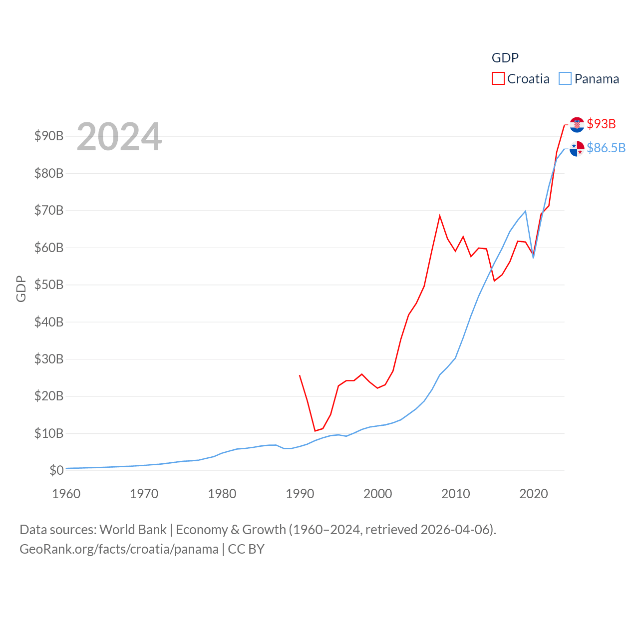 By GDP, Croatia ranks 75/197 ($93B) and Panama ranks 78/197 ($86.5B). By GDP per capita, Croatia ranks 50/197 ($24,050), while Panama ranks 60/197 ($19,161).