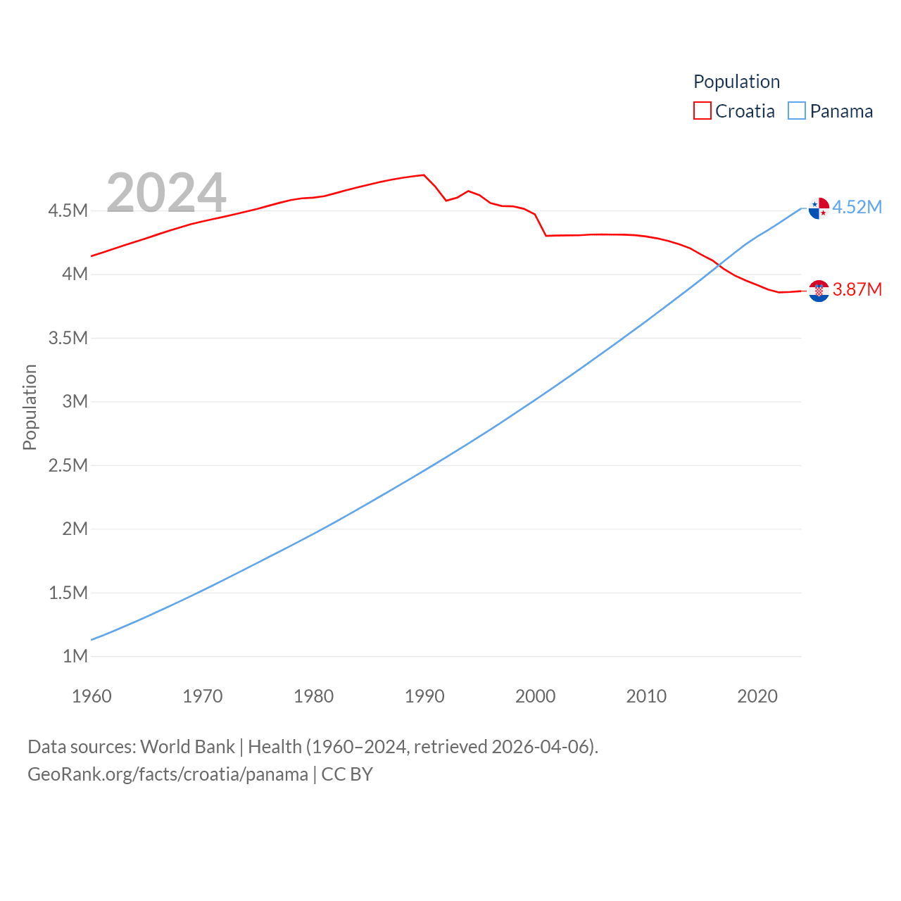Croatia has a population of 3.87M (ranked 129/197), compared with 4.52M in Panama (ranked 128/197). Croatia's land area is 21,606 sq mi versus 28,641 sq mi for Panama (ranked 123rd vs. 115th).