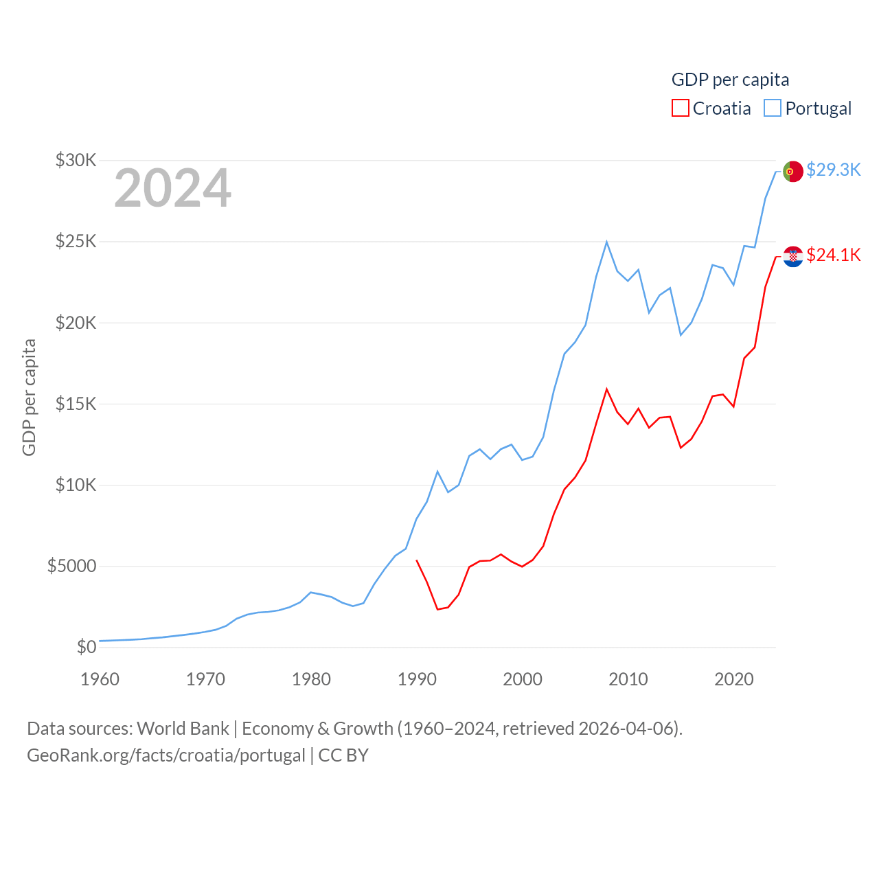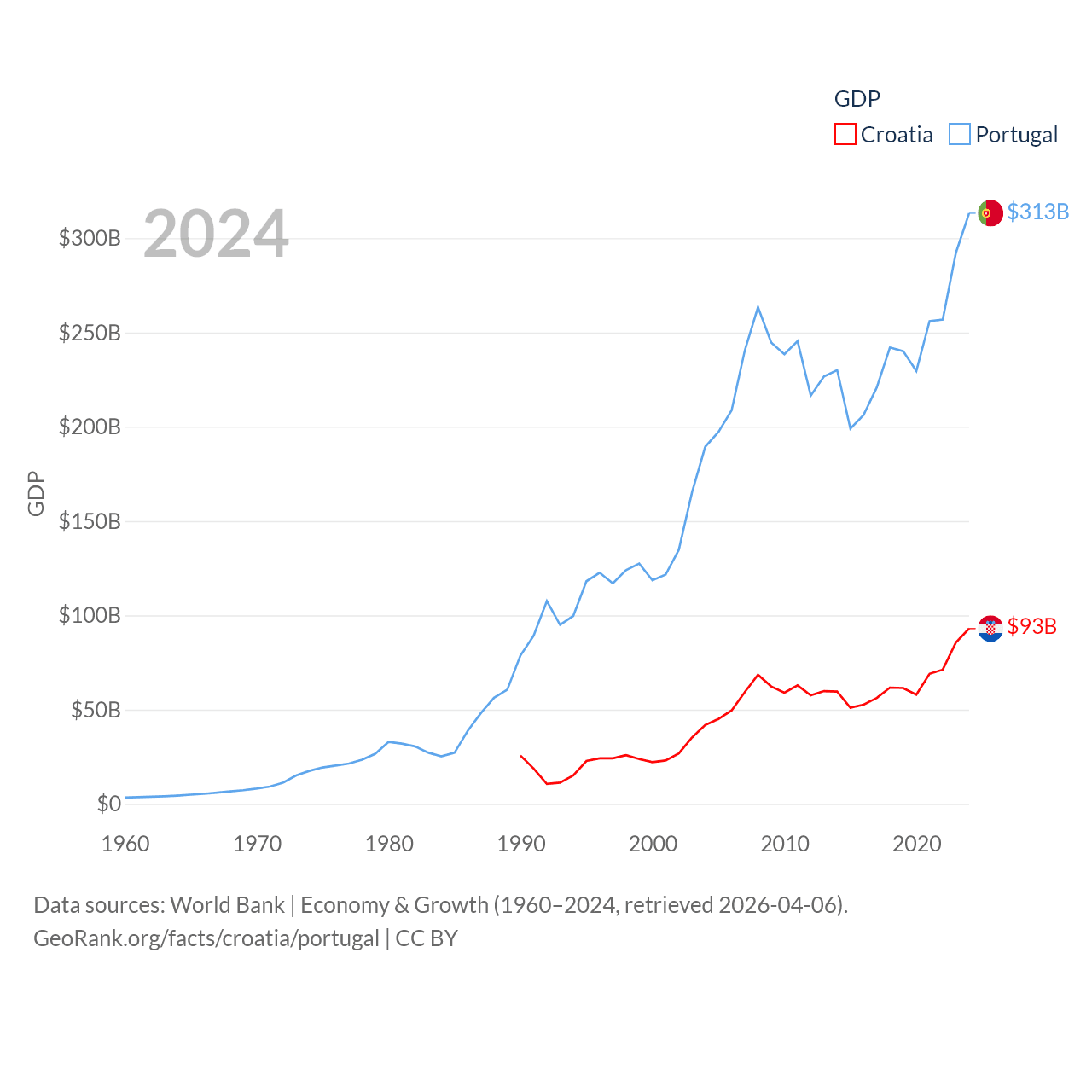 By GDP, Croatia ranks 75/197 ($93B) and Portugal ranks 46/197 ($313B). By GDP per capita, Croatia ranks 50/197 ($24,050), while Portugal ranks 44/197 ($29,292).