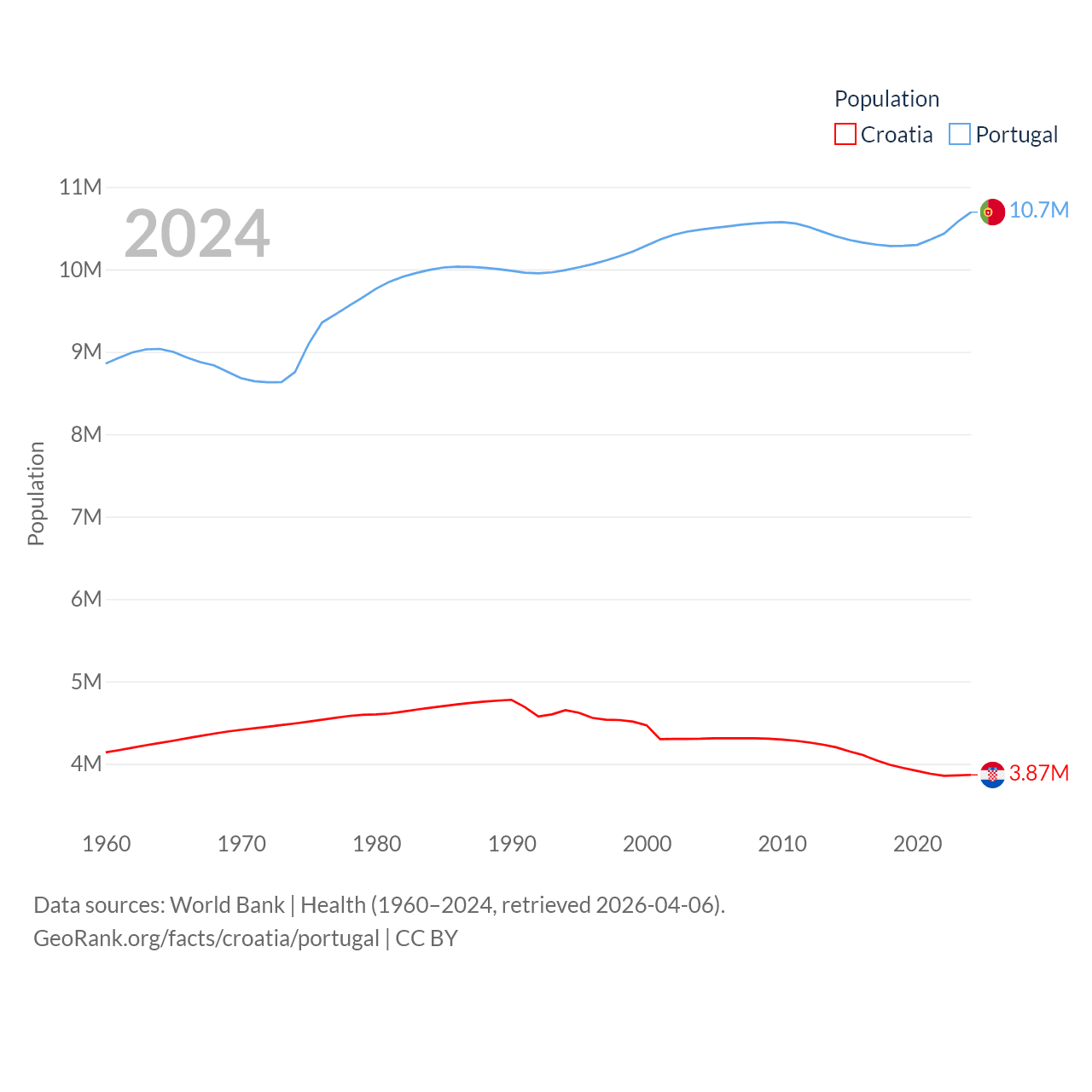 Croatia has a population of 3.87M (ranked 129/197), compared with 10.7M in Portugal (ranked 90/197). Croatia's land area is 21,606 sq mi versus 35,369 sq mi for Portugal (ranked 123rd vs. 108th).