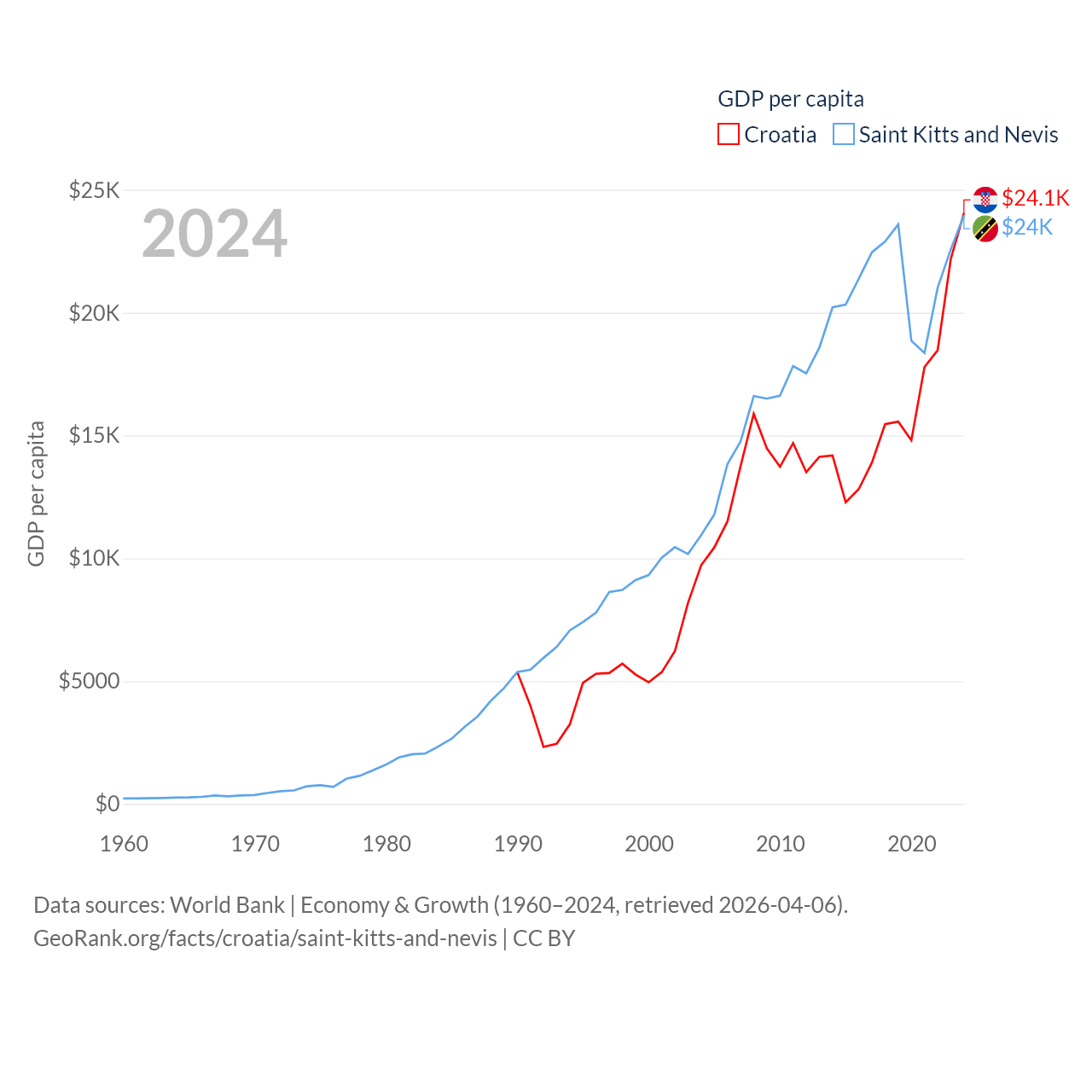 By GDP, Croatia ranks 75/197 ($93B) and Saint Kitts and Nevis ranks 187/197 ($1.12B). By GDP per capita, Croatia ranks 50/197 ($24,050), while Saint Kitts and Nevis ranks 51/197 ($23,961).