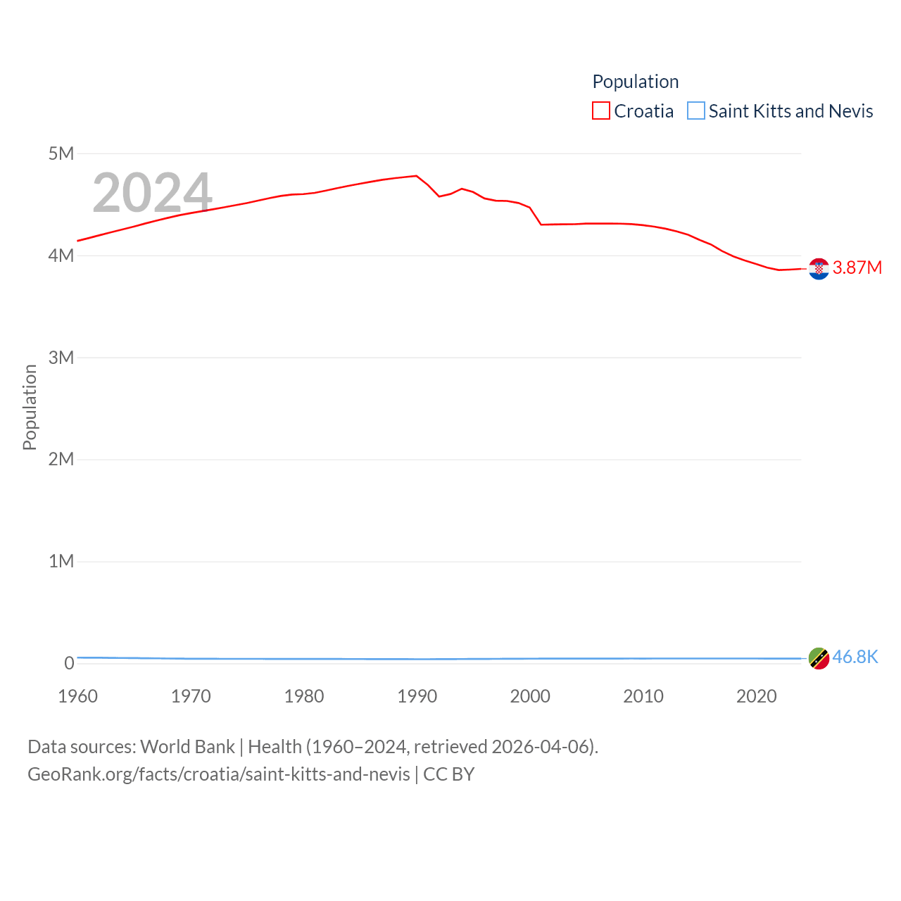 Croatia has a population of 3.87M (ranked 129/197), compared with 46.8K in Saint Kitts and Nevis (ranked 189/197). Croatia's land area is 21,606 sq mi versus 100.4 sq mi for Saint Kitts and Nevis (ranked 123rd vs. 189th).