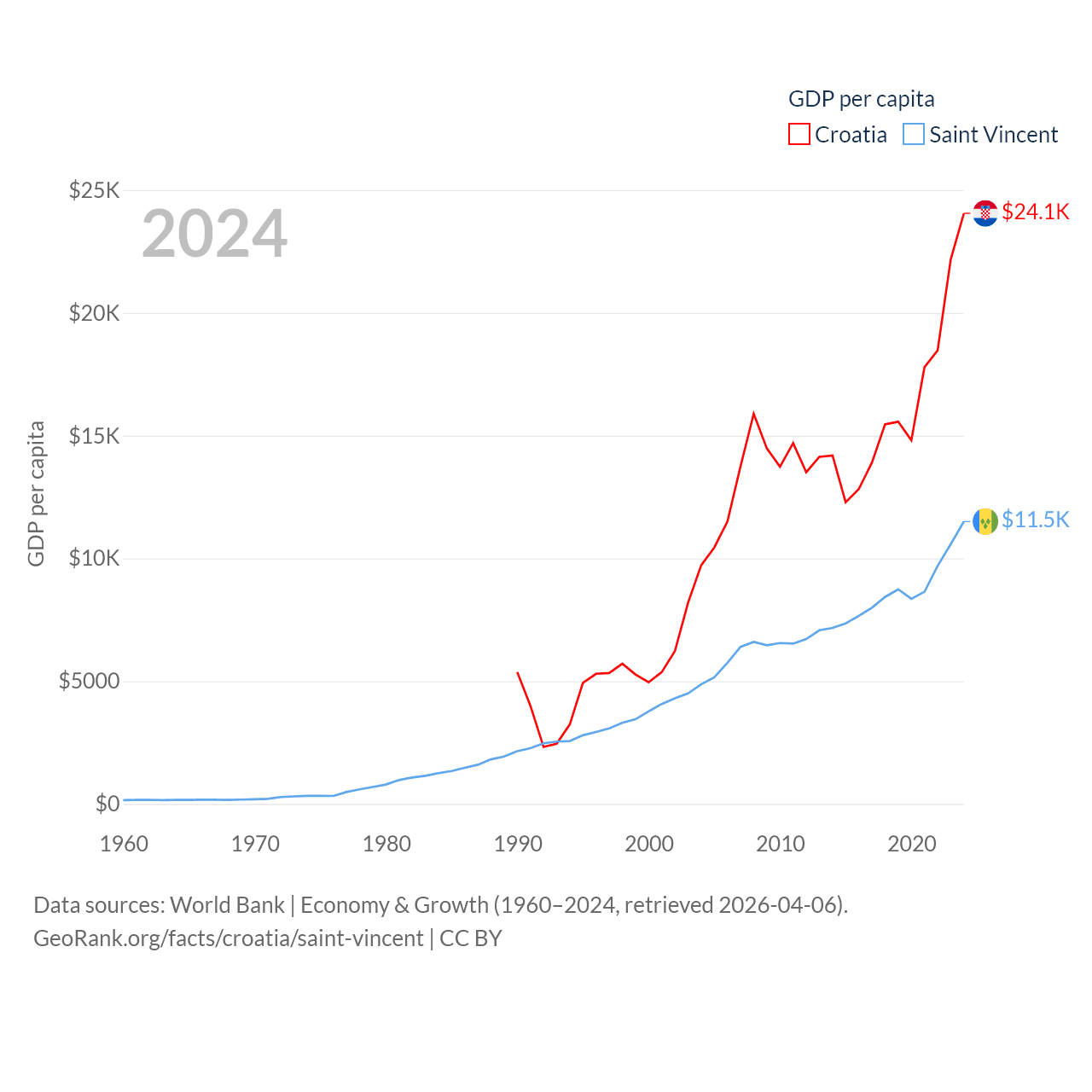 By GDP, Croatia ranks 75/197 ($93B) and Saint Vincent ranks 186/197 ($1.16B). By GDP per capita, Croatia ranks 50/197 ($24,050), while Saint Vincent ranks 81/197 ($11,501).