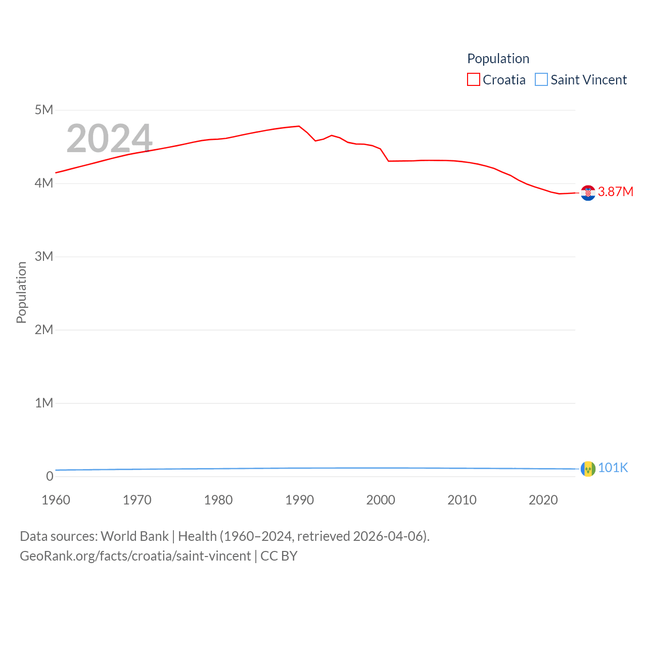 Croatia has a population of 3.87M (ranked 129/197), compared with 101K in Saint Vincent (ranked 184/197). Croatia's land area is 21,606 sq mi versus 150.6 sq mi for Saint Vincent (ranked 123rd vs. 185th).