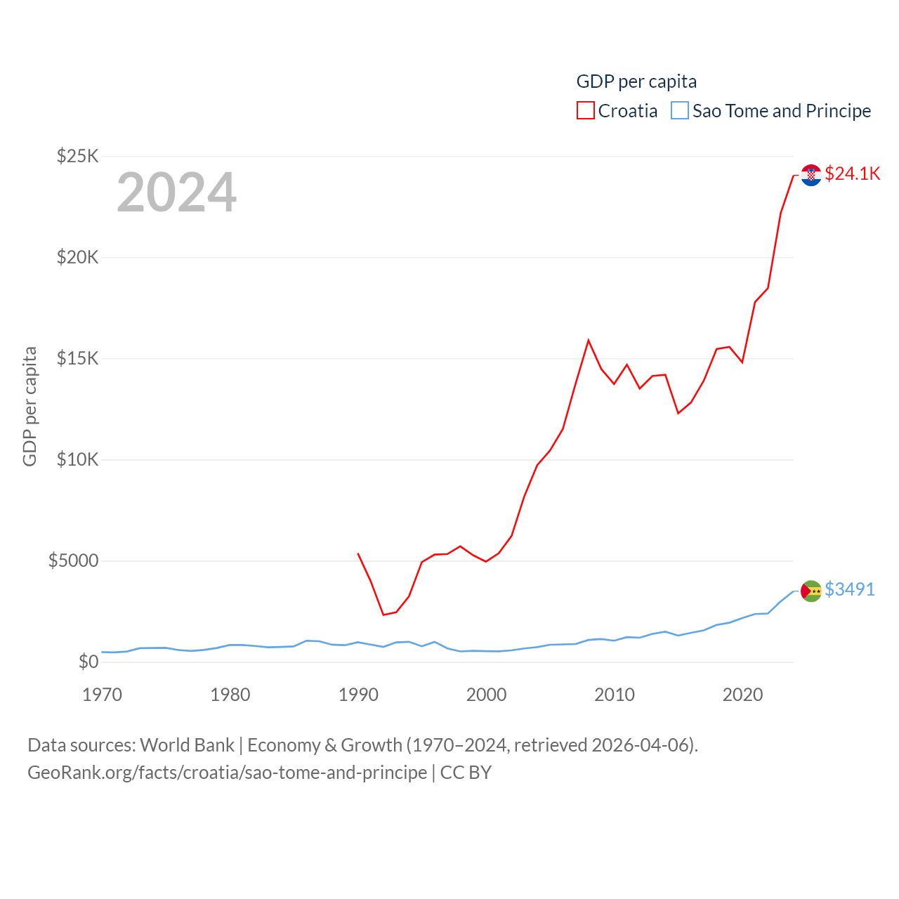 By GDP, Croatia ranks 75/197 ($93B) and Sao Tome and Principe ranks 189/197 ($822M). By GDP per capita, Croatia ranks 50/197 ($24,050), while Sao Tome and Principe ranks 134/197 ($3,491).