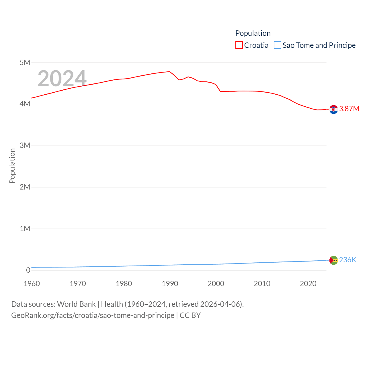 Croatia has a population of 3.87M (ranked 129/197), compared with 236K in Sao Tome and Principe (ranked 176/197). Croatia's land area is 21,606 sq mi versus 371 sq mi for Sao Tome and Principe (ranked 123rd vs. 172nd).