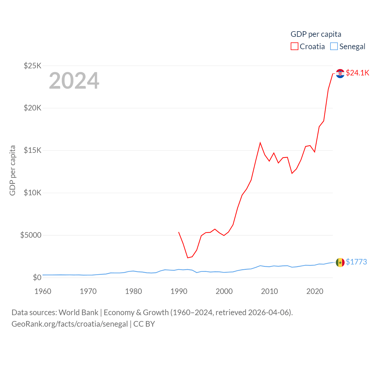 By GDP, Croatia ranks 75/197 ($93B) and Senegal ranks 109/197 ($32.8B). By GDP per capita, Croatia ranks 50/197 ($24,050), while Senegal ranks 159/197 ($1,773).