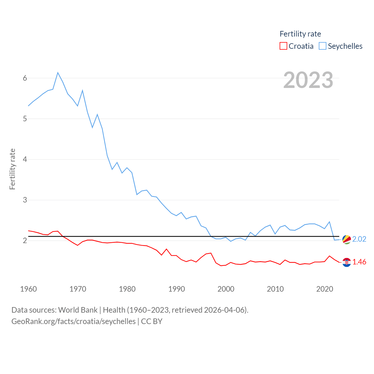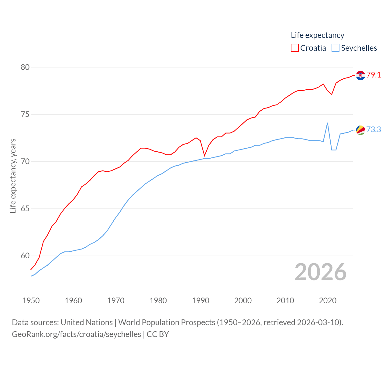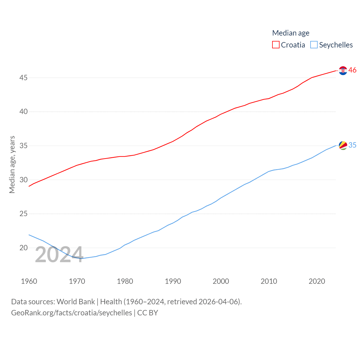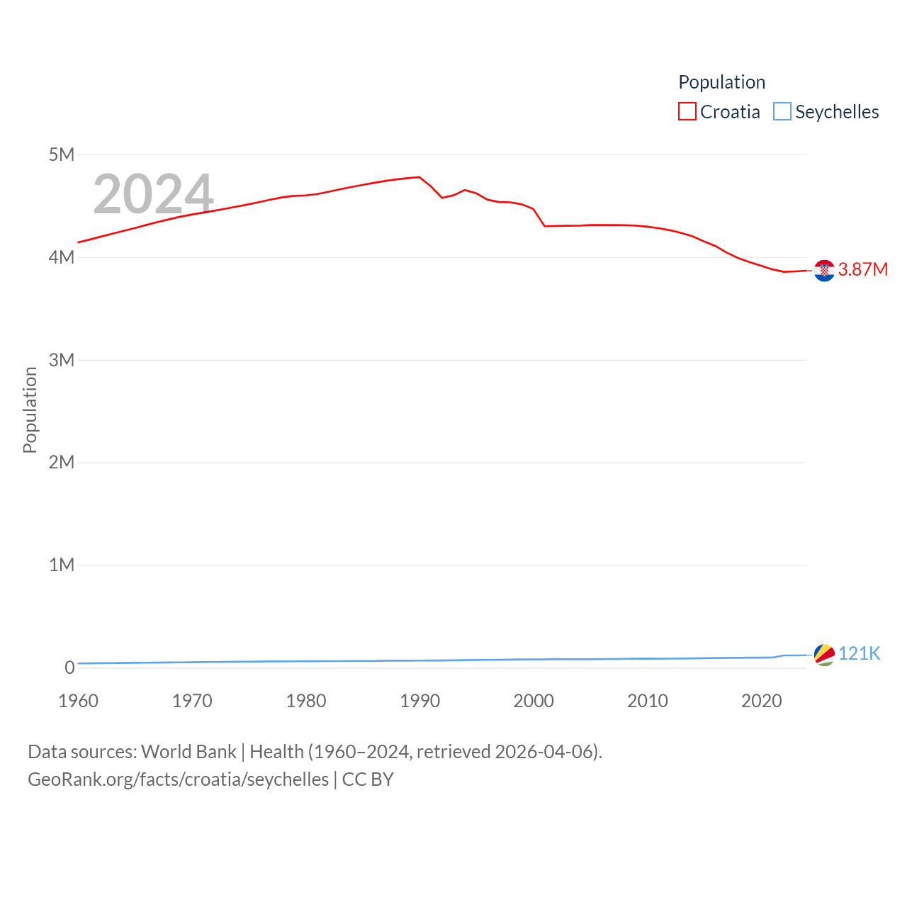 Croatia has a population of 3.87M (ranked 129/197), compared with 121K in The Seychelles (ranked 181/197). Croatia's land area is 21,606 sq mi versus 177.6 sq mi for The Seychelles (ranked 123rd vs. 181st).