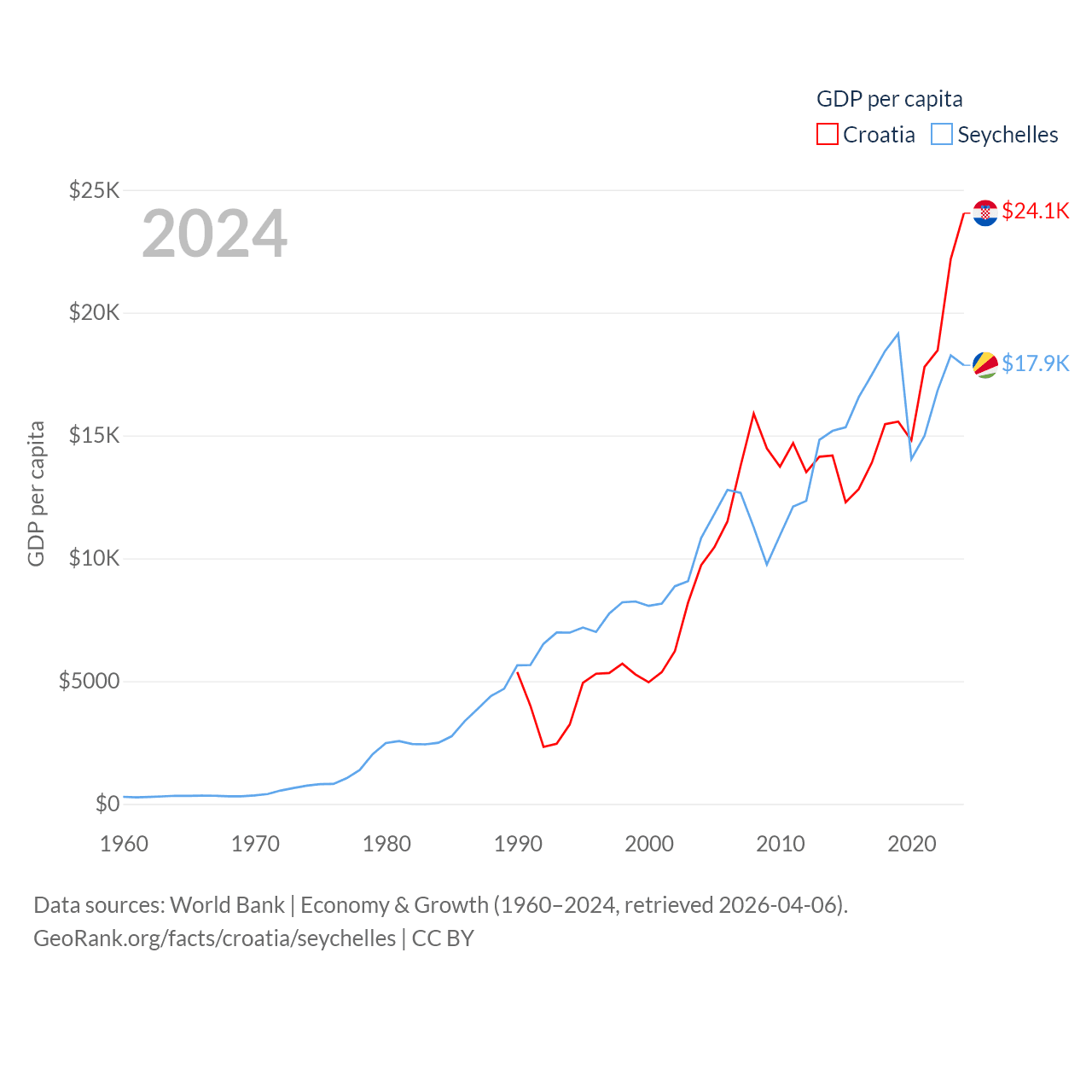 By GDP, Croatia ranks 75/197 ($93B) and The Seychelles ranks 178/197 ($2.17B). By GDP per capita, Croatia ranks 50/197 ($24,050), while The Seychelles ranks 63/197 ($17,859).